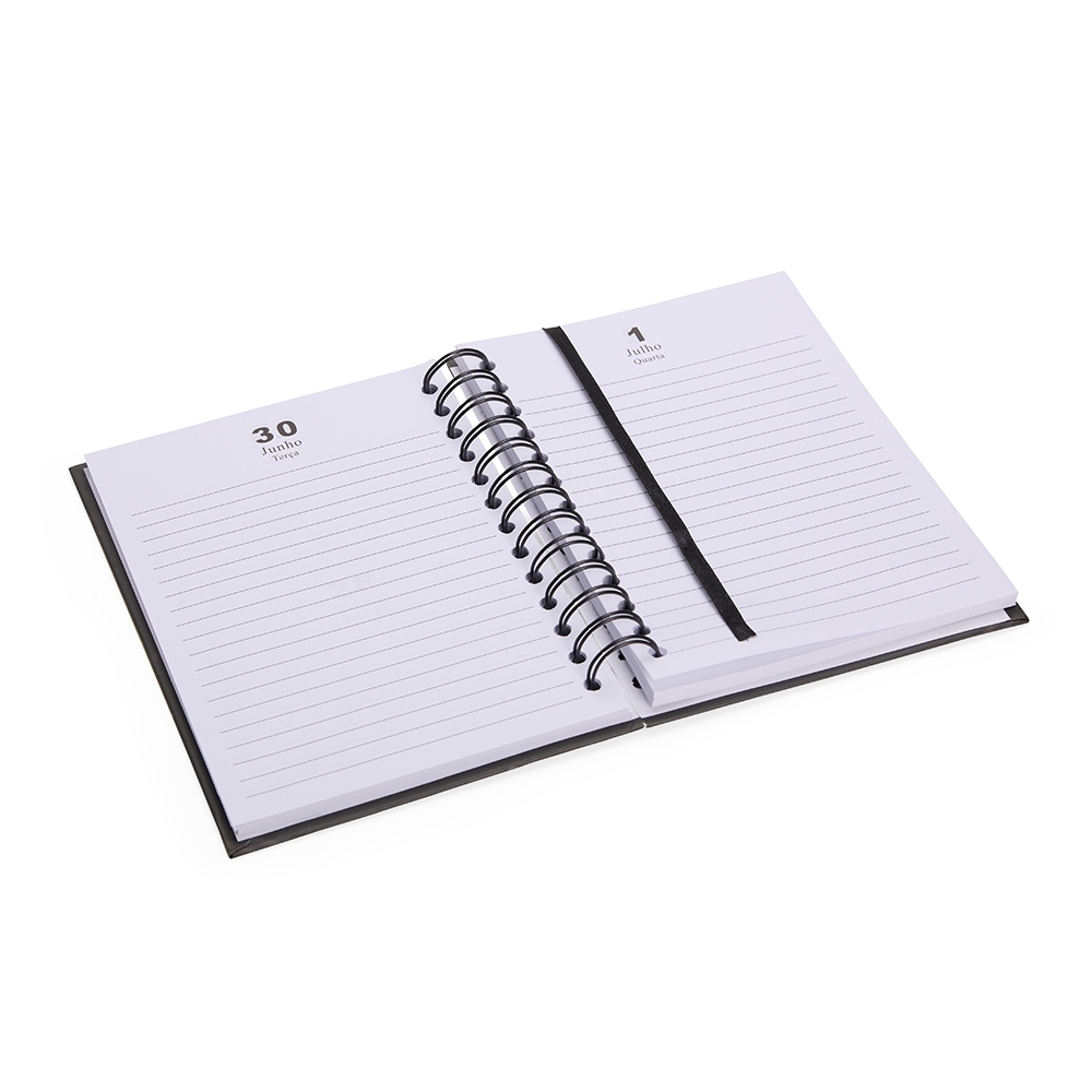 Agenda diária em capa dura, encadernação Wire-O, elástico de fechamento e marca-páginas em cetim. Contém ainda páginas dedicadas a dados pessoais, calendários de 2026 a 2028, planejamento mensal e lista de contatos.