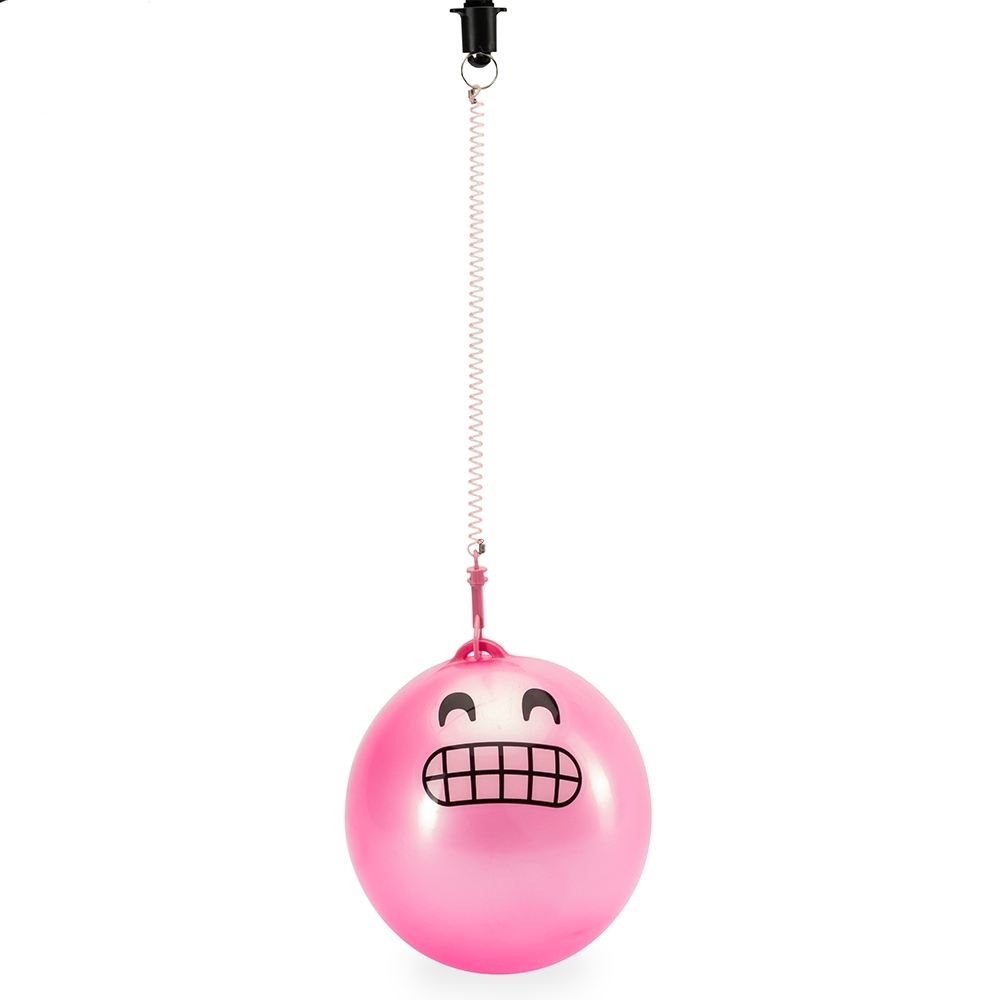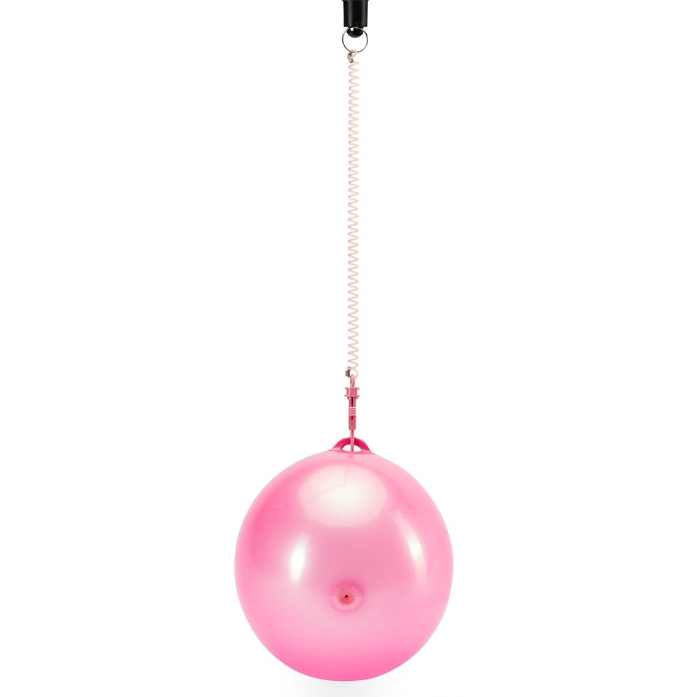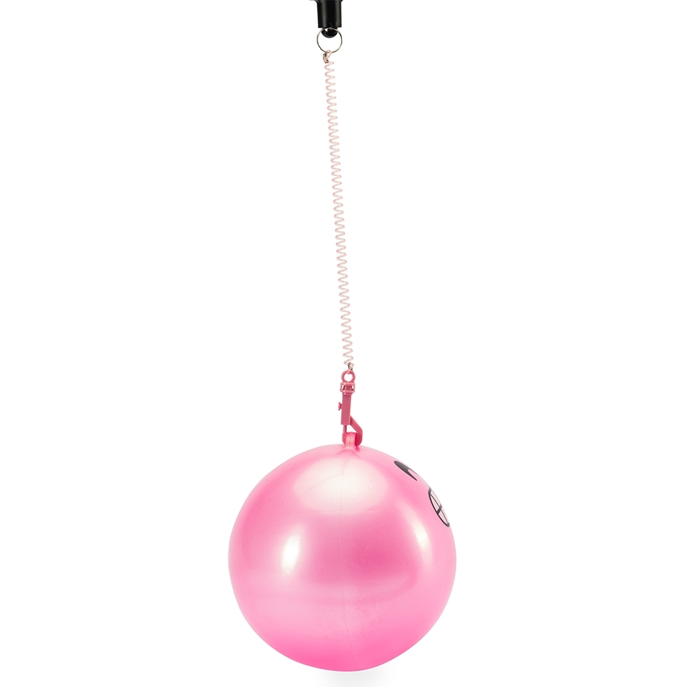 Bola inflável em vinil acompanhada de cordão em mola plástica flexível com mosquetão em uma extremidade e argola metálica na outra.