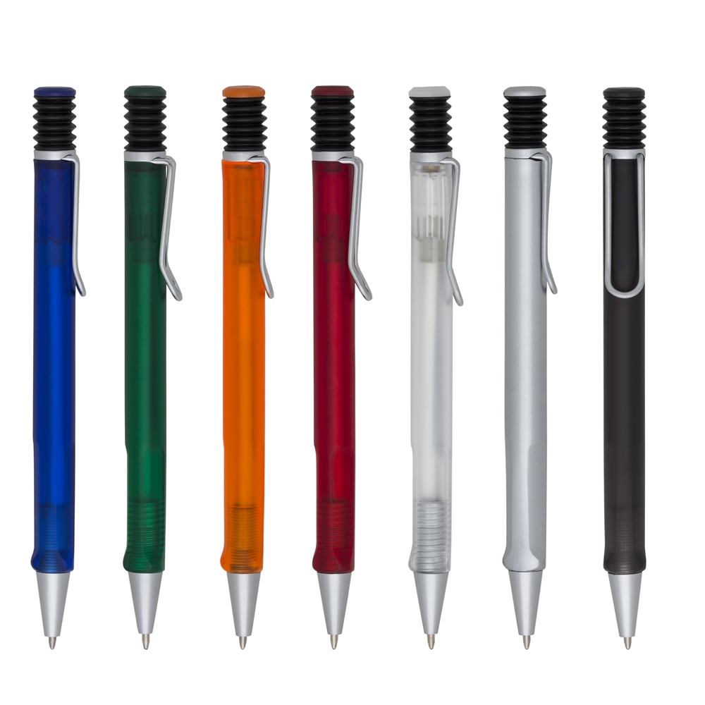 Caneta plástica com carga esferográfica azul e acionamento por clique.