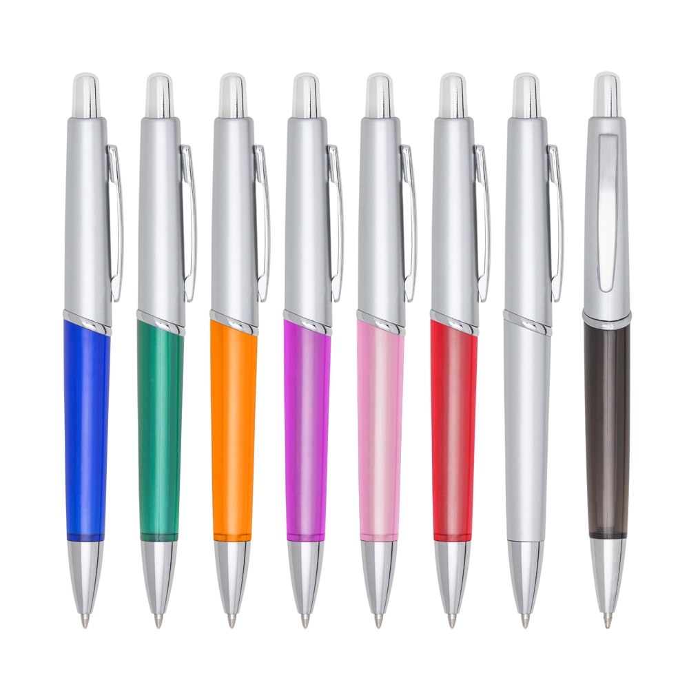 Caneta plástica com carga esferográfica azul e acionamento por clique.