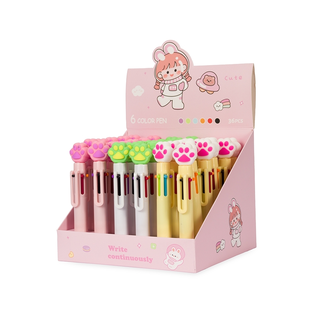 Caneta esferográfica mista com seis cargas coloridas de 1.0mm e acionamento por clique. Sua construção em plástico e enfeite no formato de patas garantem uma escrita suave e precisa com um toque de estilo único.