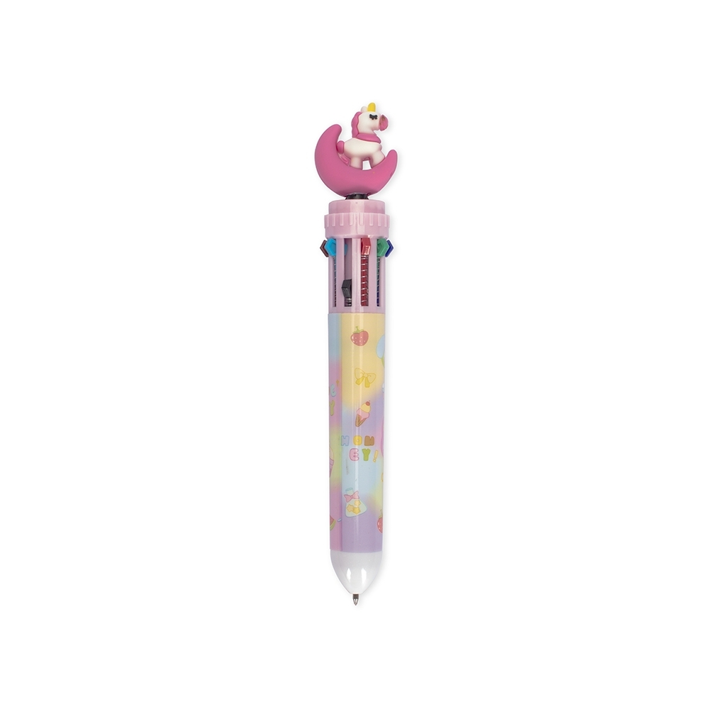 Caneta esferográfica multicolor mista com enfeite estilizado no formato de unicórnio. Possui dez cargas de 1,0mm e acionamento por clique. Sua estrutura em plástico oferece uma pegada leve para uma escrita suave.