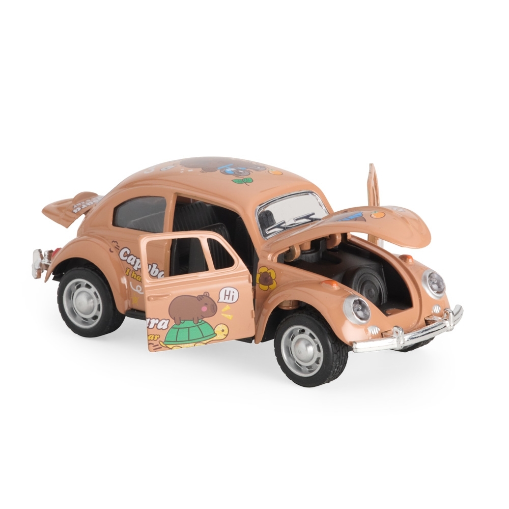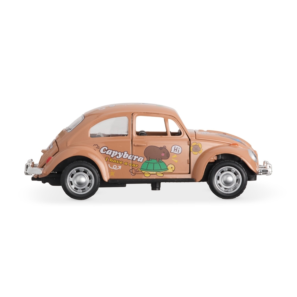 Carro em miniatura com pintura decorativa de capivaras e estrutura feita em metal e plástico. Conta com fricção nas rodas traseiras, além de pneus feitos em borracha. Possui abertura funcional de portas, capô e tampa do motor.