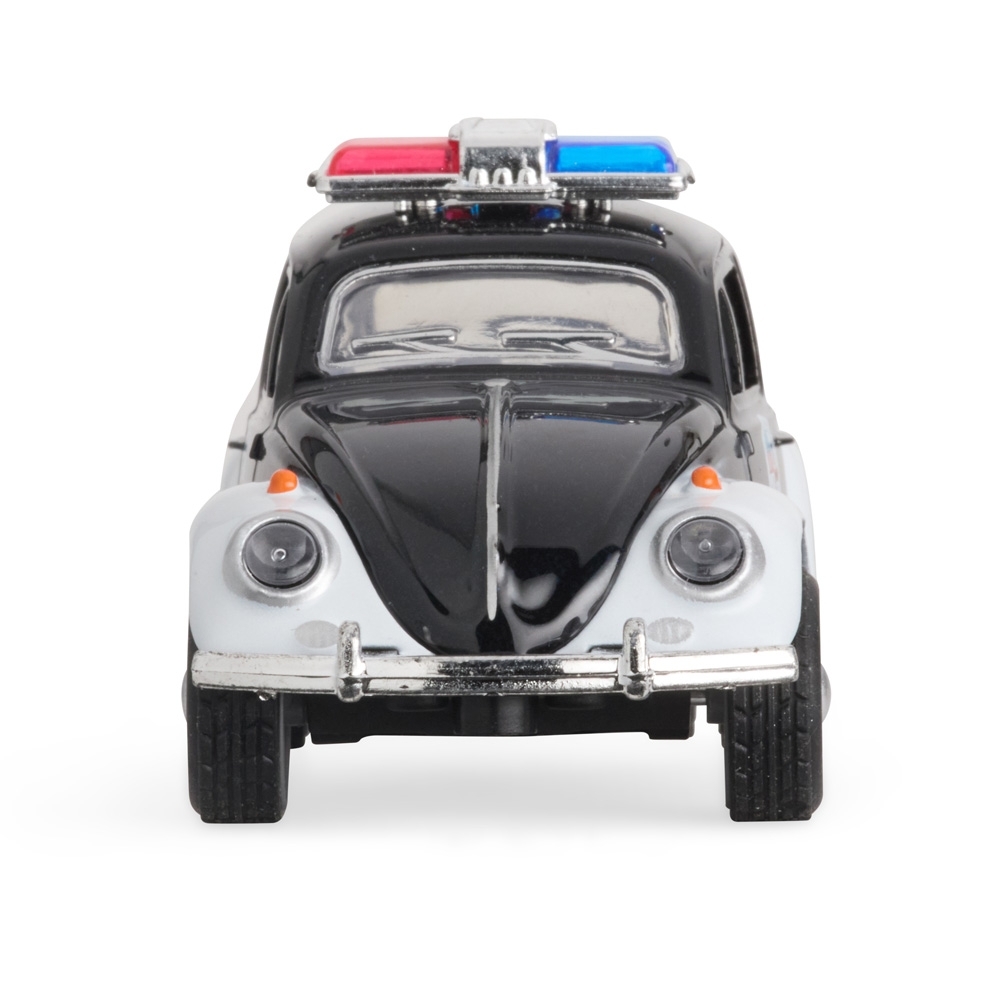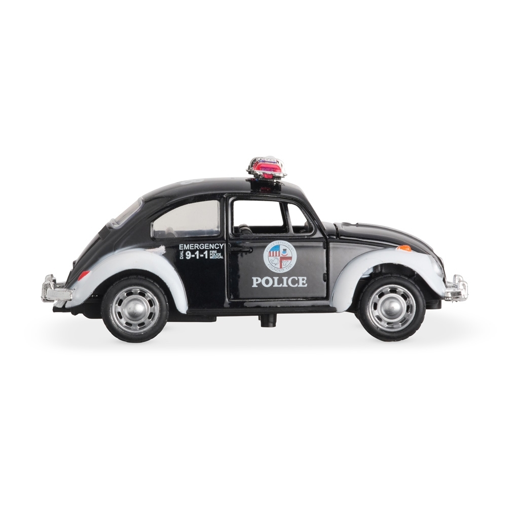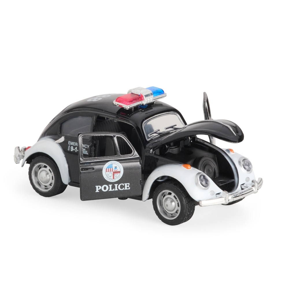 Carro em miniatura com decoração e pintura ao estilo policial com estrutura em metal e plástico. Conta com fricção nas rodas traseiras, além de pneus feitos em borracha. Possui abertura funcional de portas e capô.