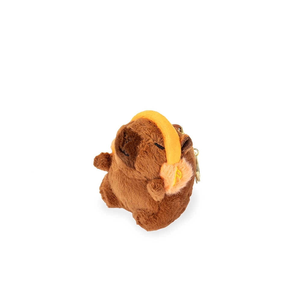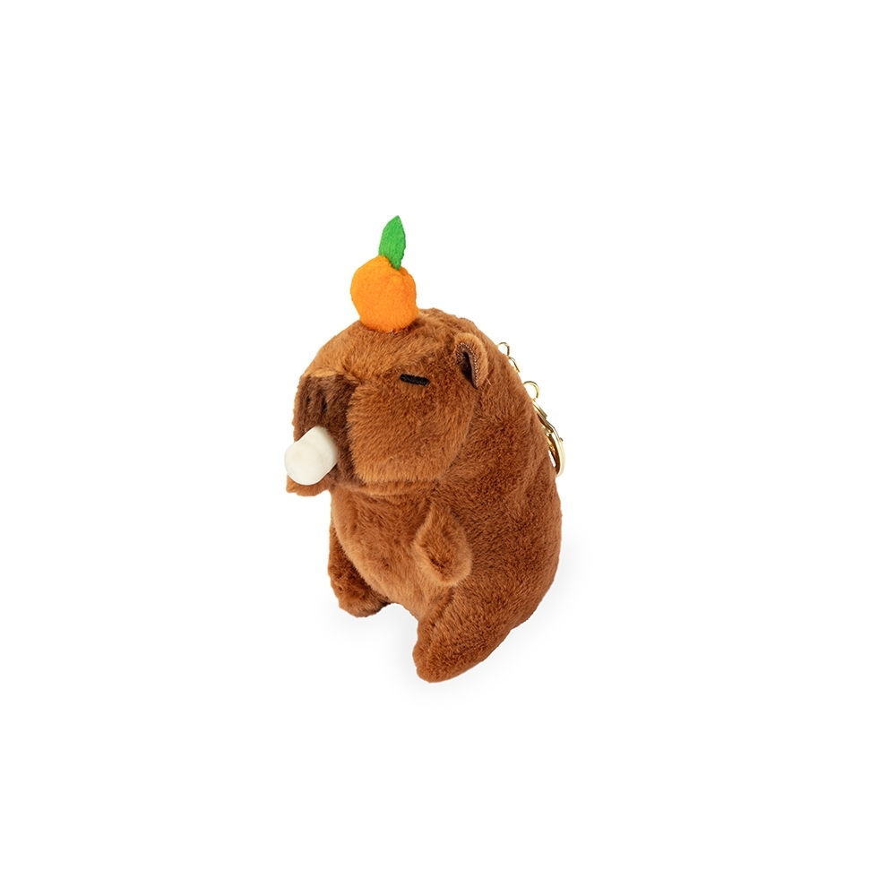 Chaveiro em pelúcia no formato de capivara. Possui argola e mosquetão de metal, além de botão interativo que reproduz música ao toque.