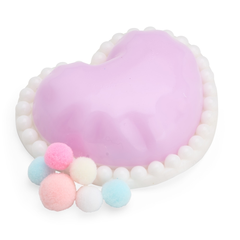 Brinquedo apertável antiestresse em formato de coração. Produzido em borracha termoplástica com superfície lisa e macia, adere facilmente a superfícies planas e acompanha bolinhas de pelúcia para decoração.