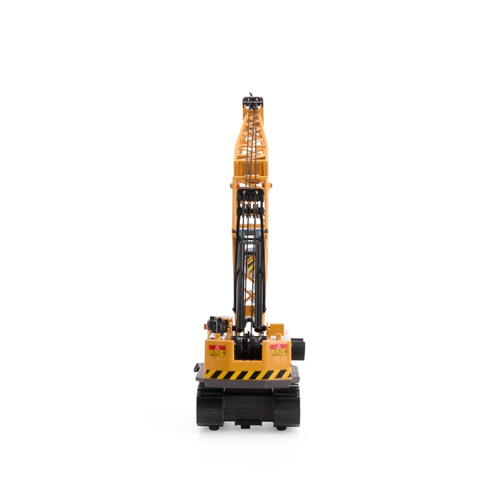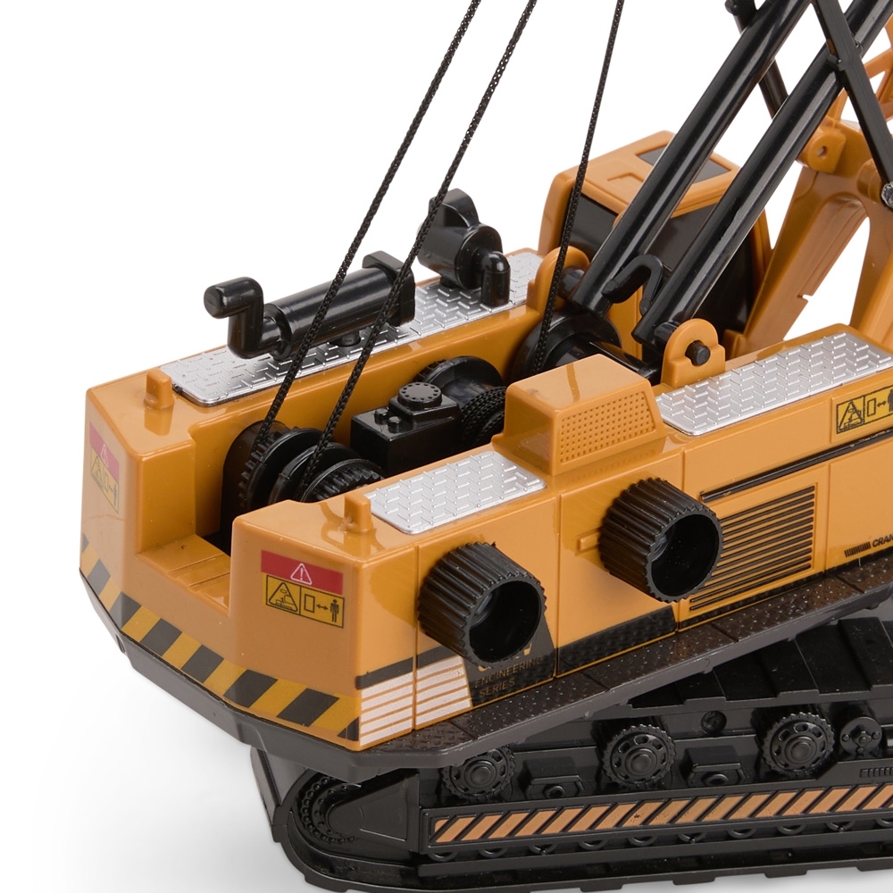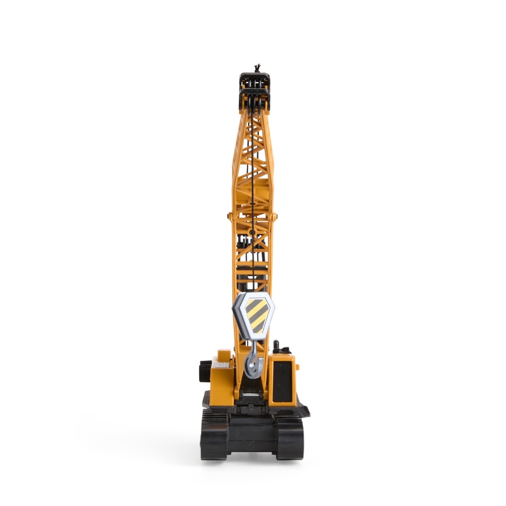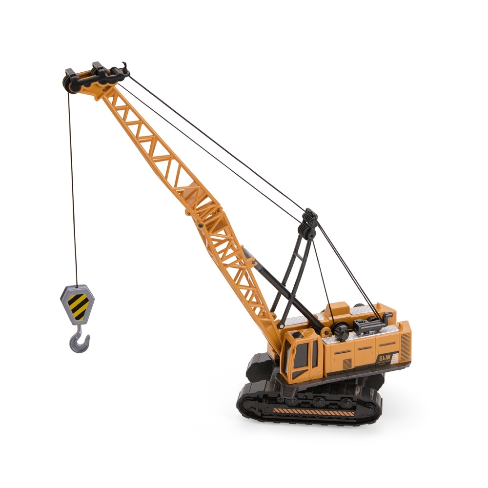 Guindaste em miniatura produzido em plástico e metal. Possui cordões de nylon com botões giratórios que controlam a movimentação do gancho e a sustentação da lança do guindaste. Conta ainda com mecanismo de fricção nas rodas centrais e movimentação manual de 360 graus em seu próprio eixo.