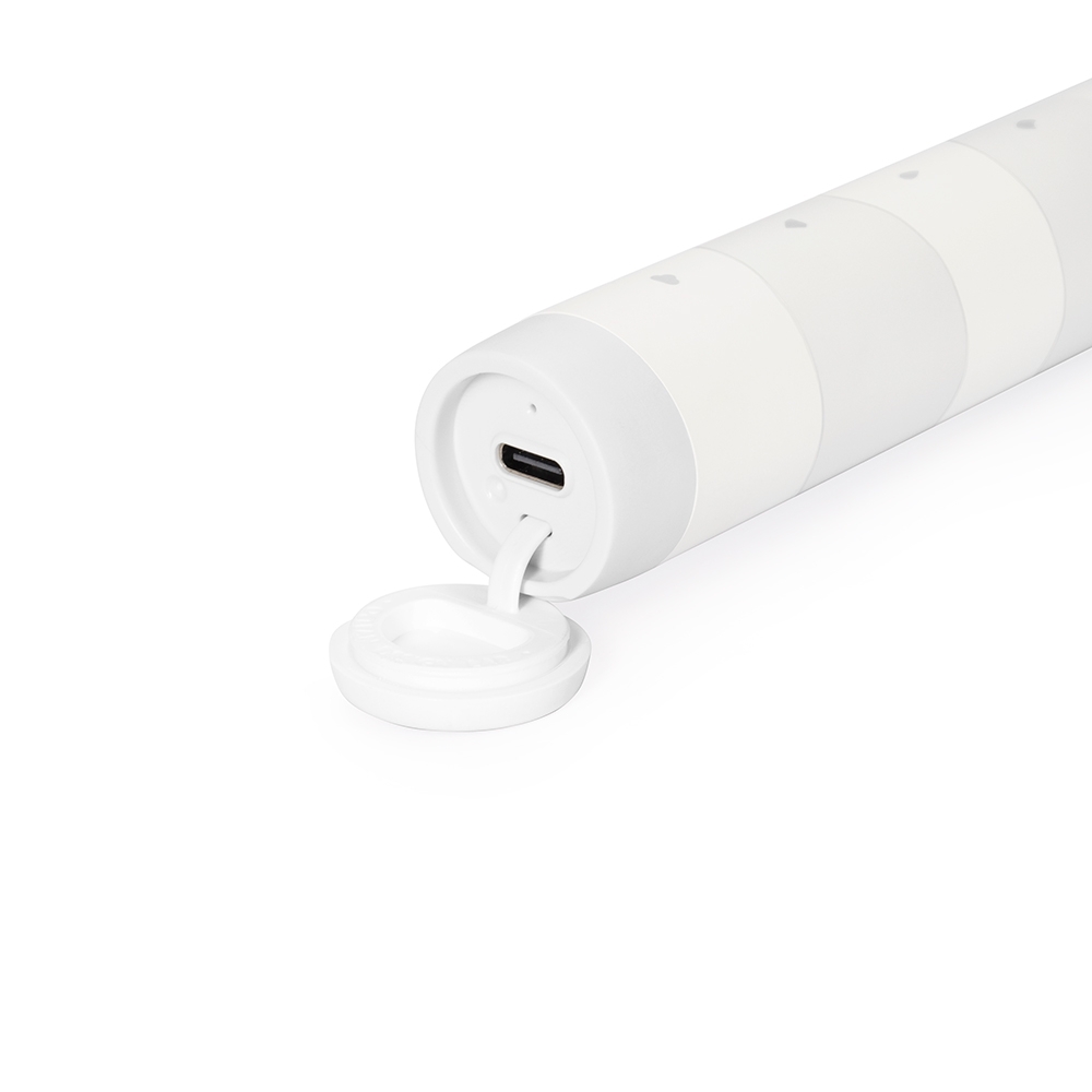 Escova de dentes elétrica com estrutura em plástico e metal. Com bateria de duração estimada de até 180 dias, oferece cinco modos de escovação diferentes que funcionam em ciclos de aproximadamente dois minutos: matutino, noturno, limpeza, clareador e suave. Acompanha cabo USB-C para carregamento.