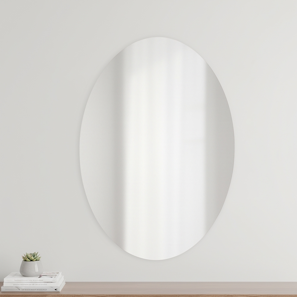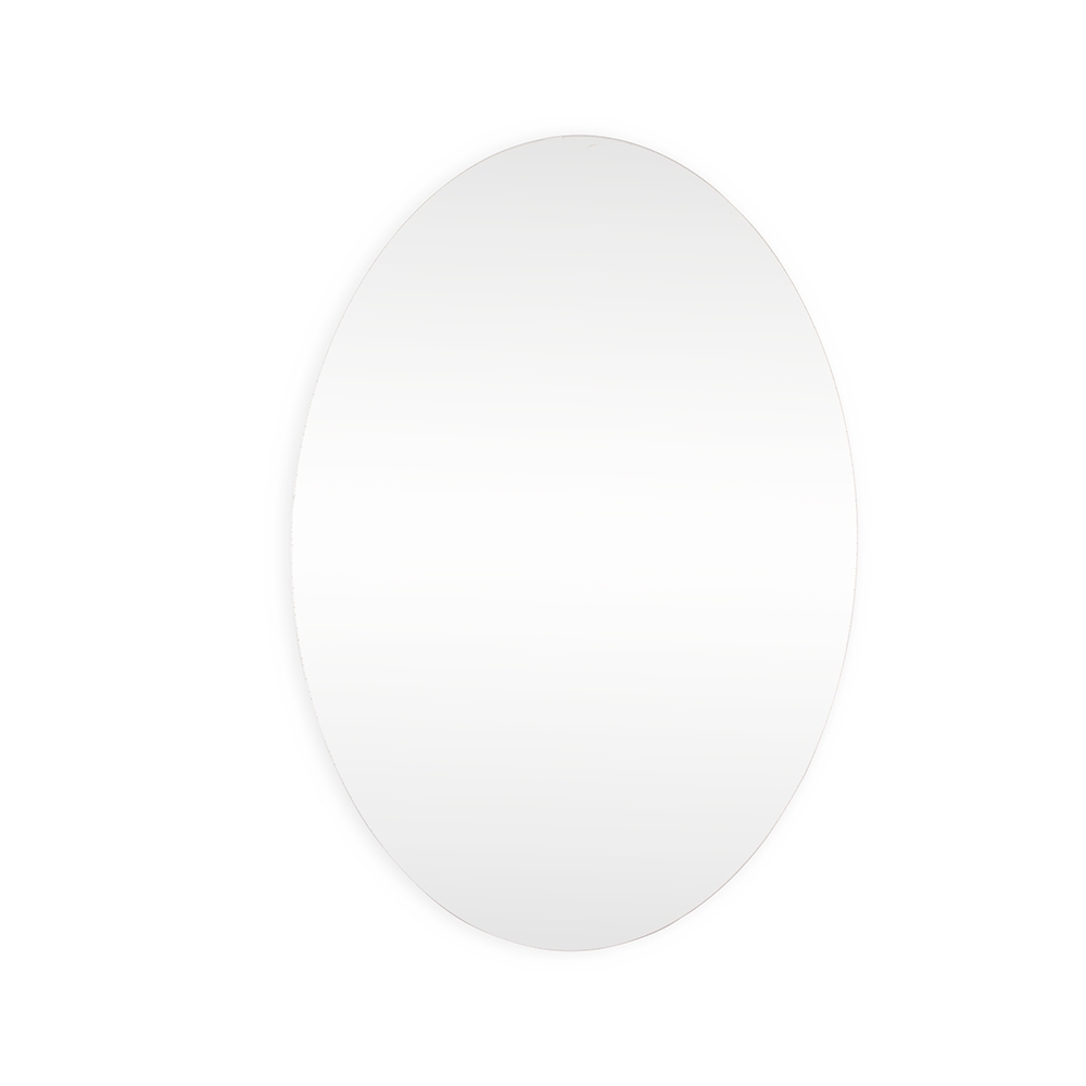 Espelho feito em acrílico com formato oval e fundo adesivo para fixação em paredes e outras superfícies planas.