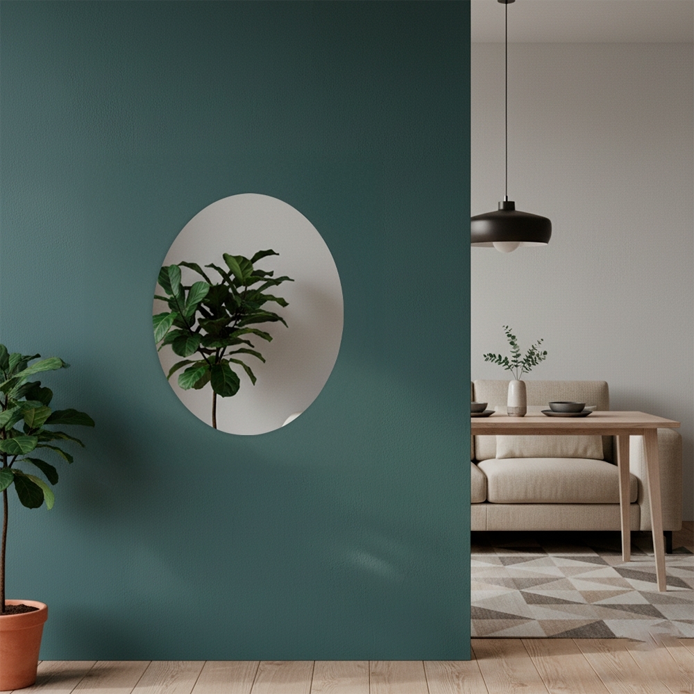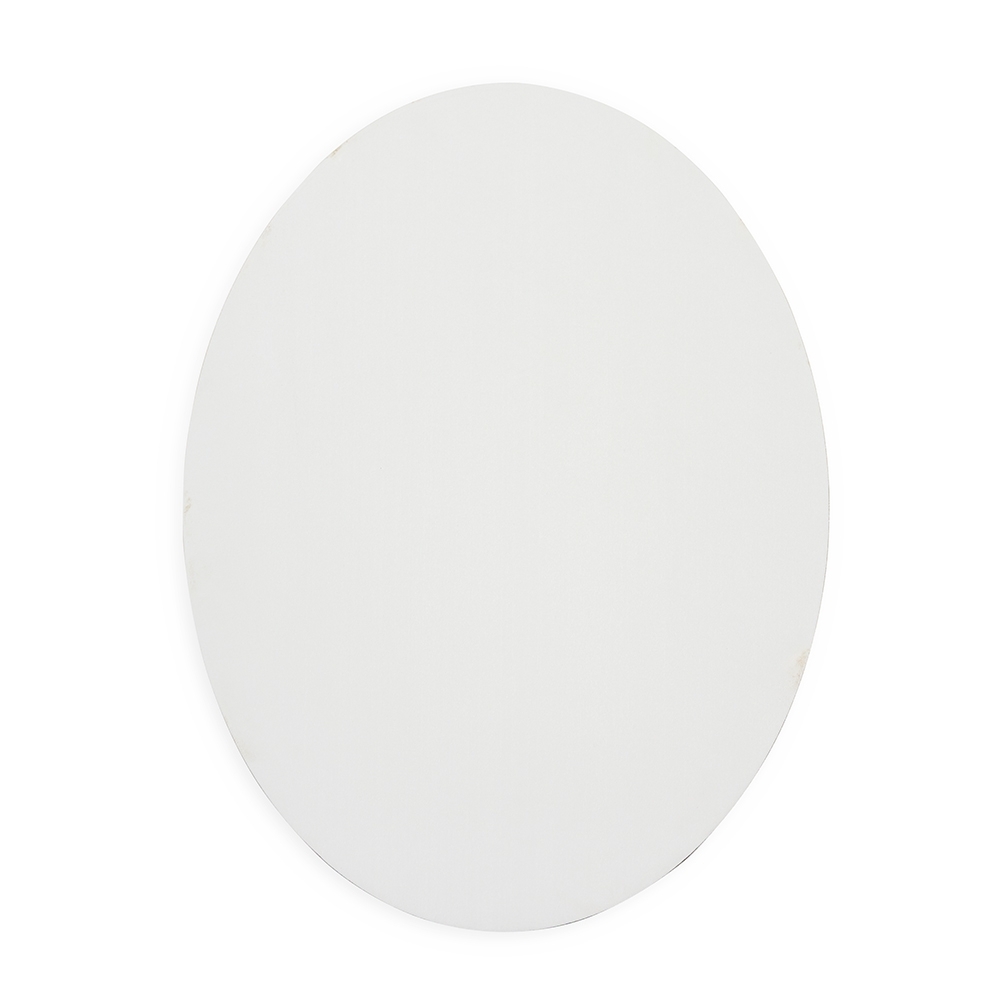 Espelho oval em acrílico com fundo adesivo para fixação em paredes e outras superfícies lisas.
