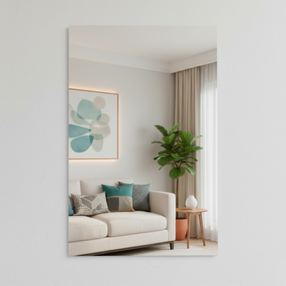 Espelho retangular em acrílico com fundo adesivo para fixação em paredes e outras superfícies lisas.