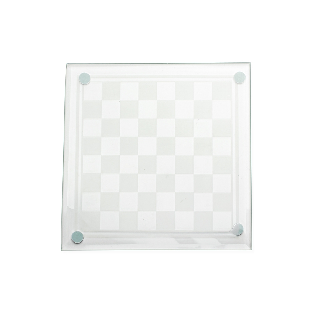 Jogo de Xadrez com tabuleiro e peças em vidro com acabamento fosco e transparente. Acompanha cartela de adesivos de feltro para fixação na base das peças.