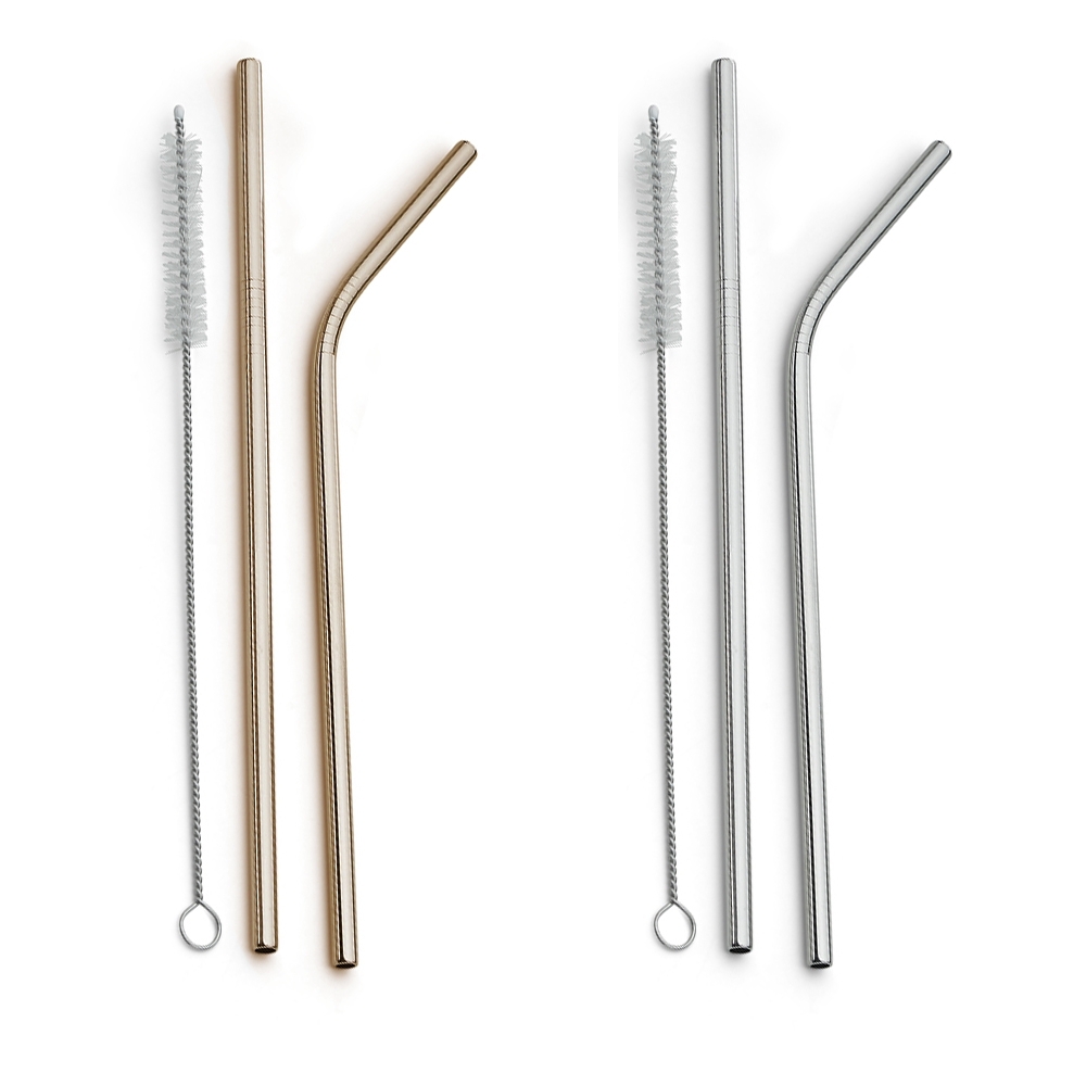 Kit com 2 canudos de aço e 1 limpador. Contém canudo reto e canudo curvado de 215mm com detalhe superior de dez anéis, limpador com corpo de aço e ponteira plástica.