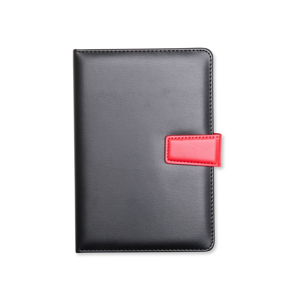 Kit executivo com duas peças, composto por uma caderneta de capa em couro sintético com fechamento magnético e cerca de 80 folhas pautadas, e uma caneta em metal com detalhes em plástico, ponteira emborrachada para uso em dispositivos touchscreen e carga esferográfica azul de 1,0 mm. Acompanha uma caixa de papelão com berço em espuma para a caneta.