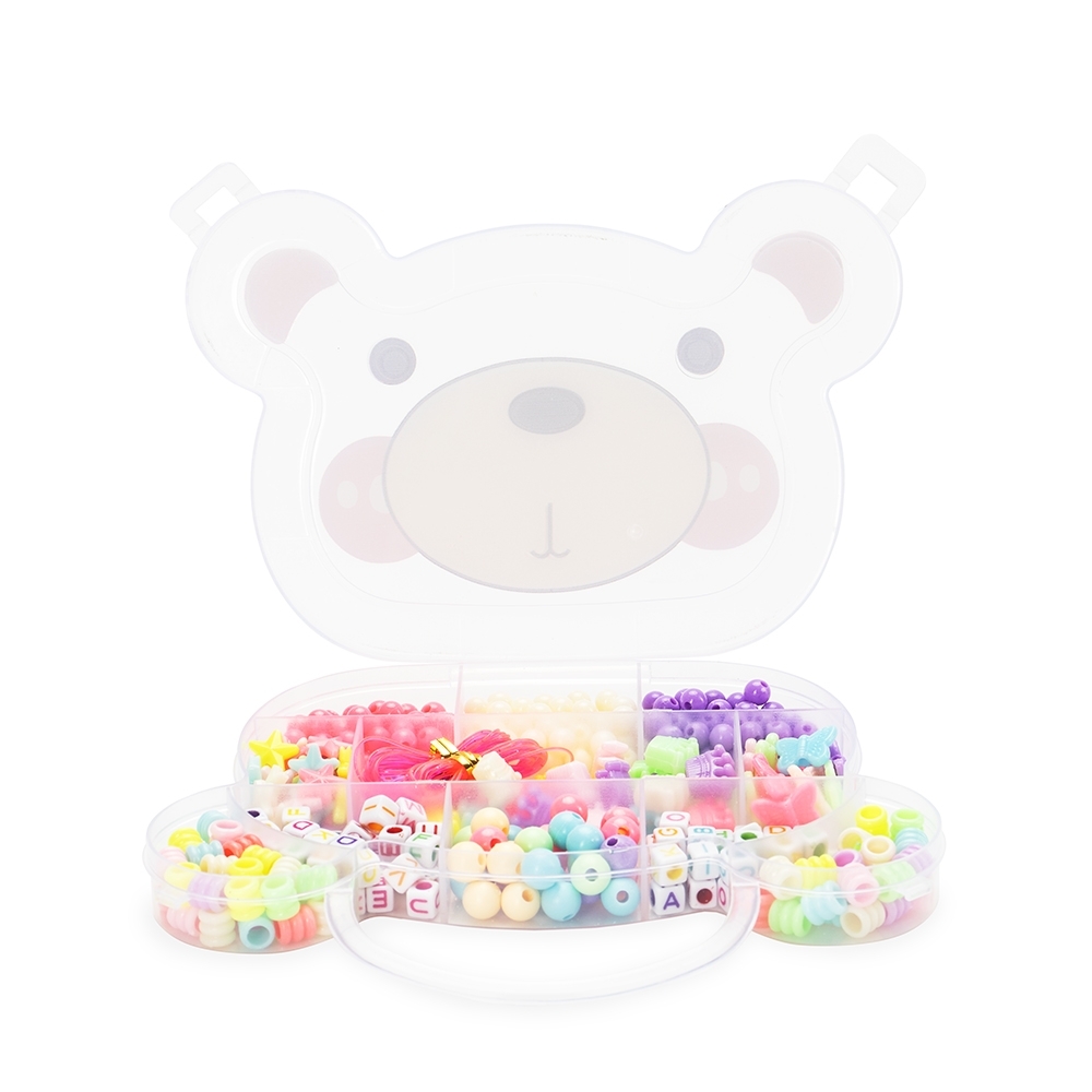 Kit para montagem de pulseiras infantis. Conta com peças coloridas de formatos variados e dois cordões de silicone para formar diversas combinações. Acompanha maleta plástica estilizada e com alça para transporte.