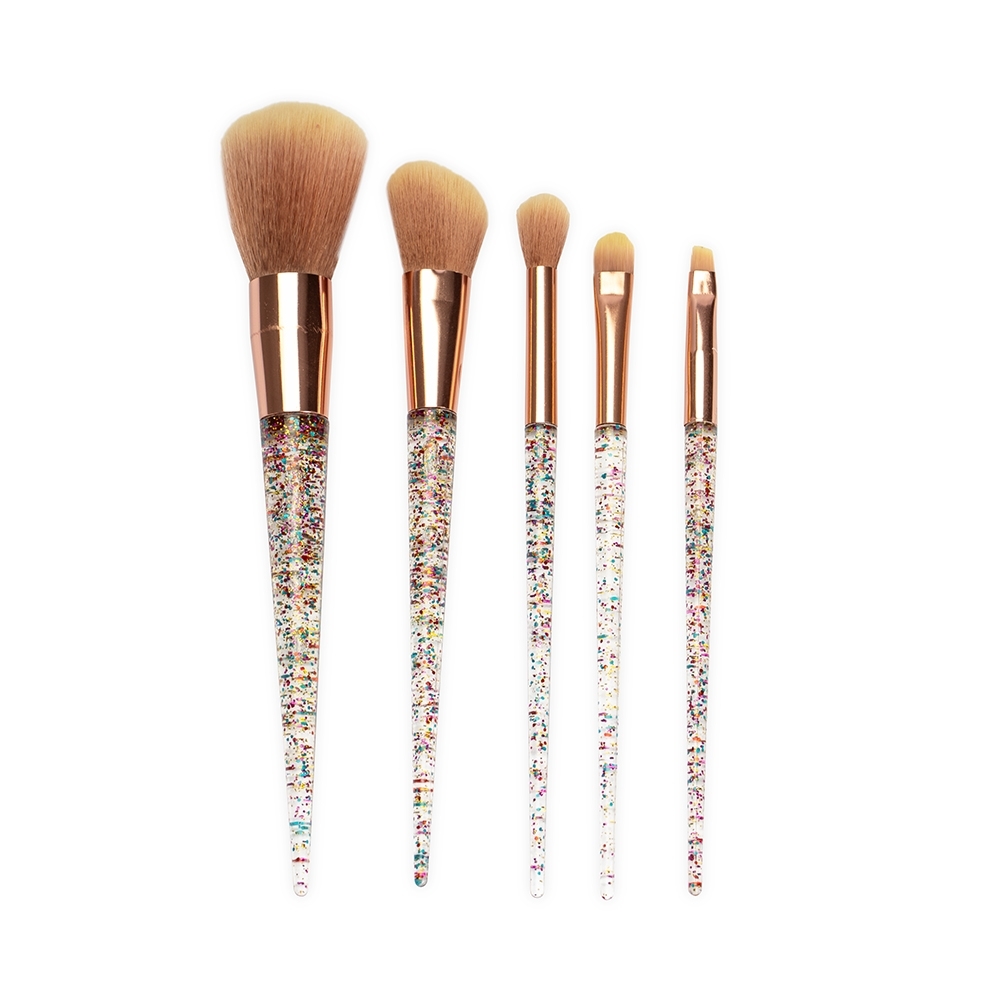 Kit composto de cinco pincéis de maquiagem com cabo em plástico e cerdas sintéticas macias. O conjunto inclui: pincel para pó, pincel para blush, pincel para esfumar, pincel língua de gato para corretivo e pincel chanfrado para delinear. Acompanha nécessaire para transporte.