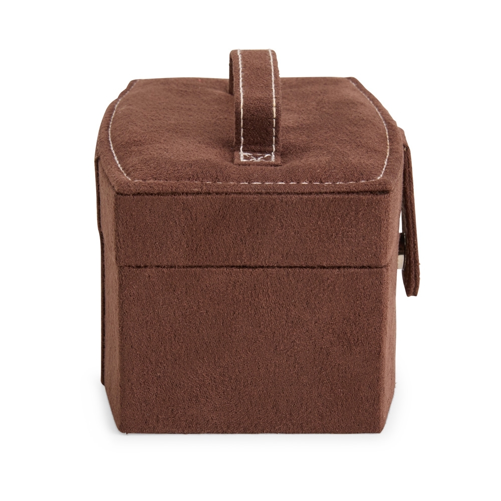Maleta porta-joias com revestimento aveludado e alça com botão magnético para fechamento. Possui espelho interno em formato retangular e compartimento removível com três divisórias, uma delas com almofadas fixas para anéis e brincos.