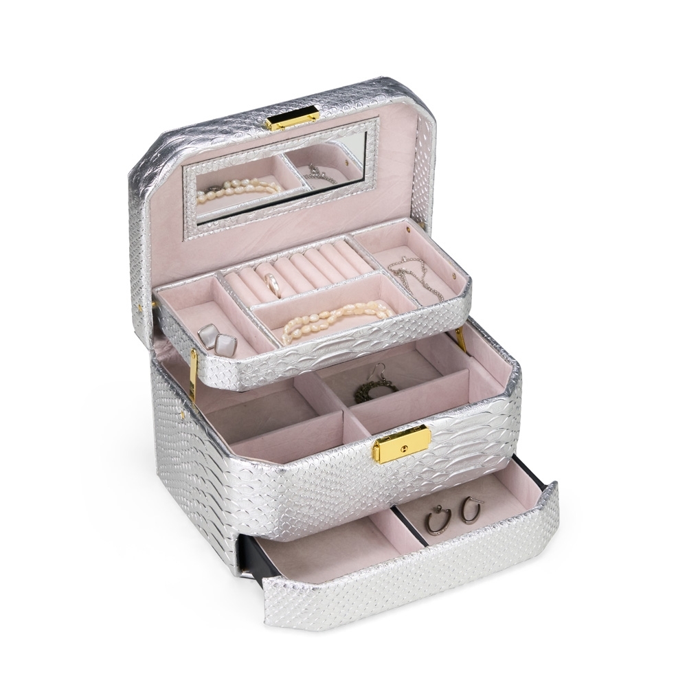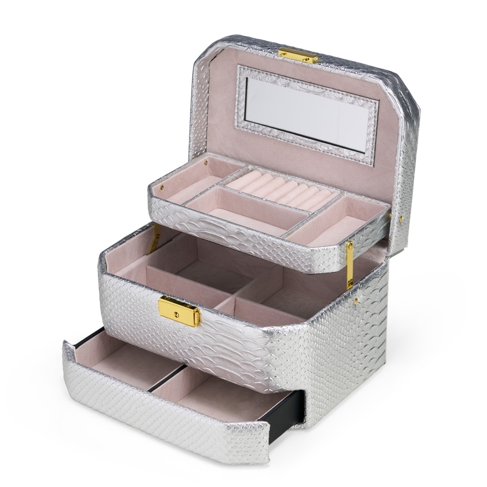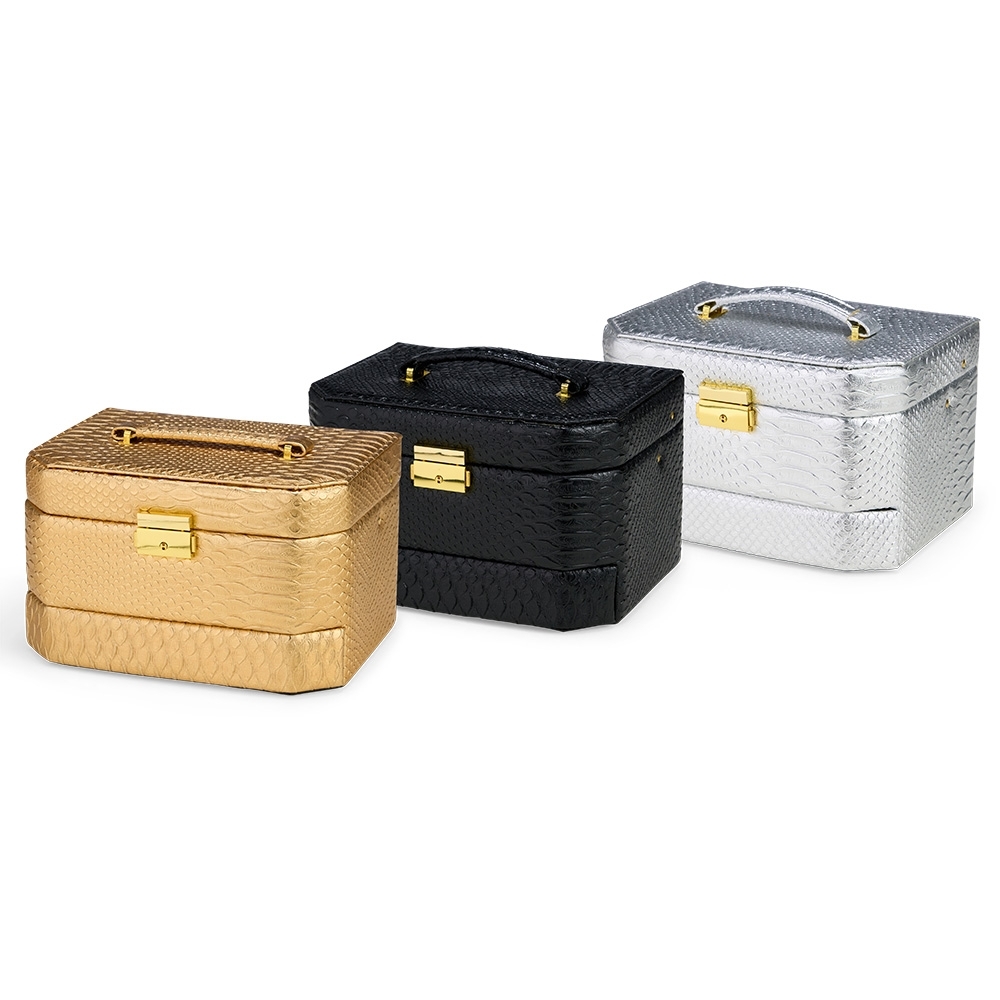 Maleta porta-joias em couro sintético com textura crocodilo, espelho interno e trava de fechamento. Possui sistema de abertura articulado que posiciona os três compartimentos principais em formato de escada, facilitando a organização dos objetos nas divisórias de revestimento aveludado.