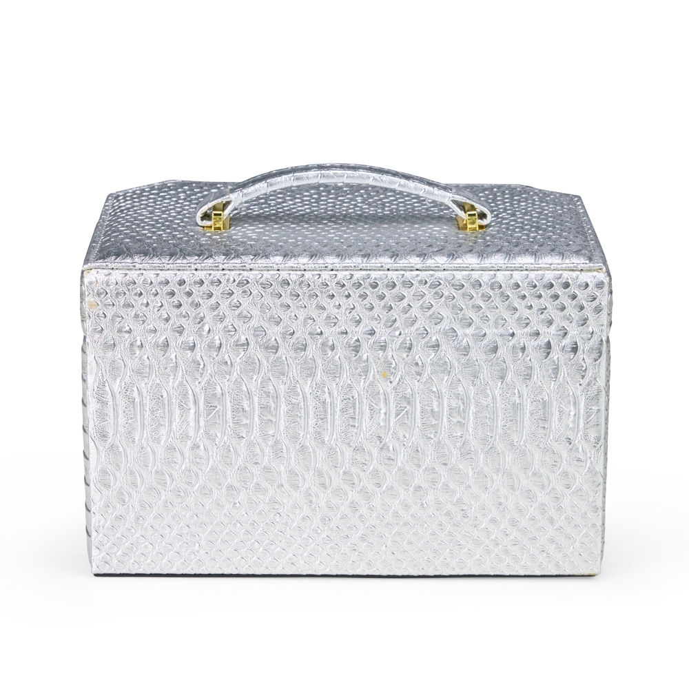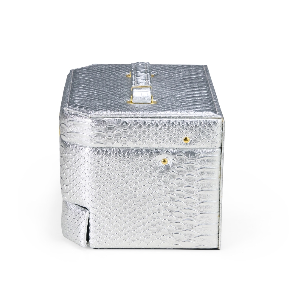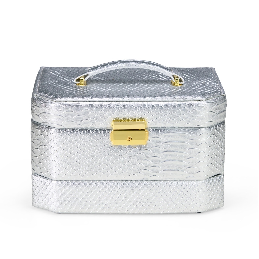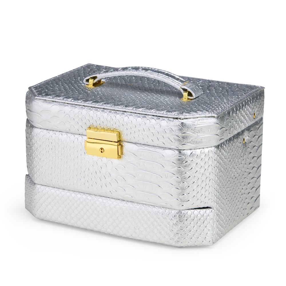Maleta porta-joias em couro sintético com textura crocodilo, espelho interno e trava de fechamento. Possui sistema de abertura articulado que posiciona os três compartimentos principais em formato de escada, facilitando a organização dos objetos nas divisórias de revestimento aveludado.