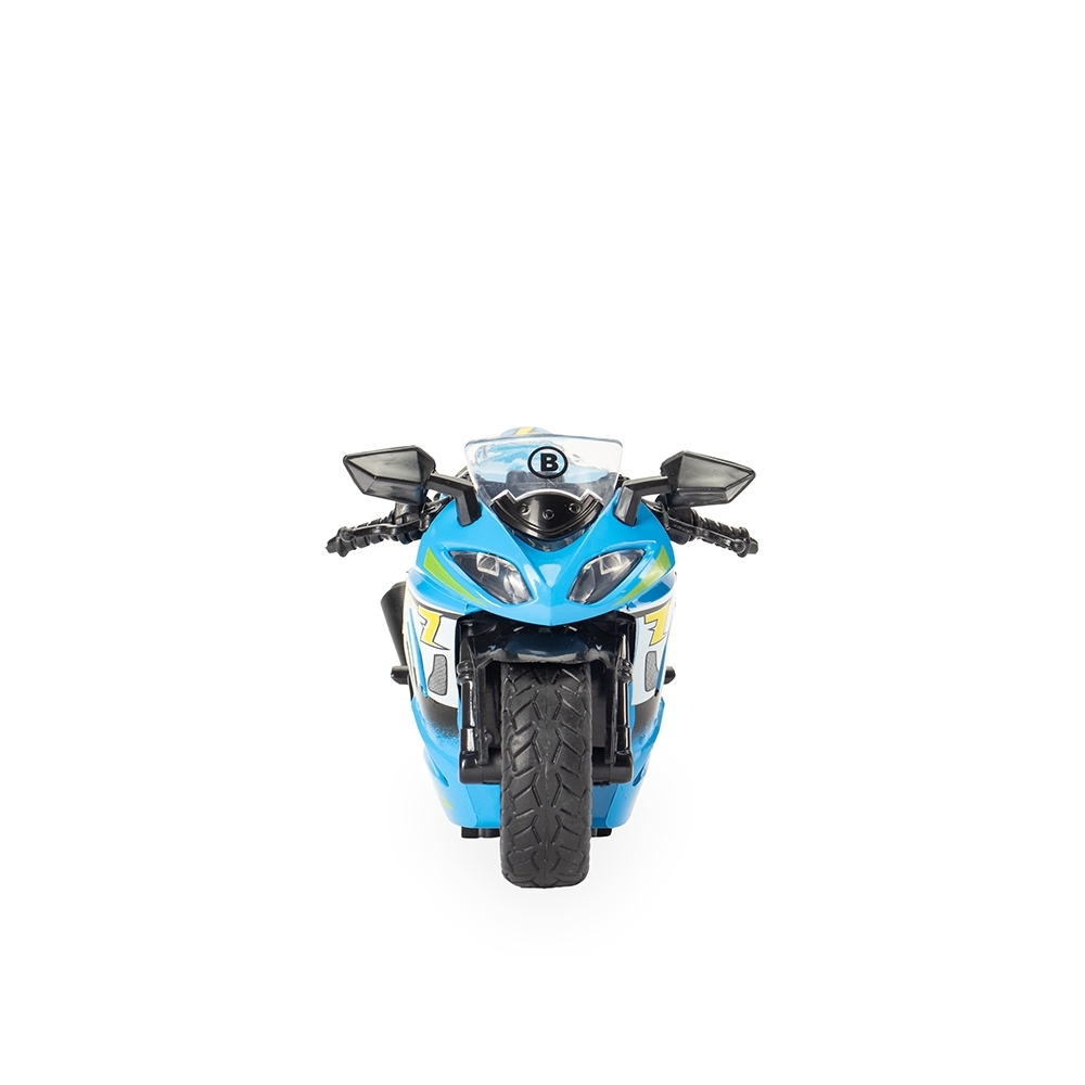 Moto em miniatura com design esportivo, estrutura em plástico, mecanismo de fricção e acionamento de iluminação e efeitos sonoros.