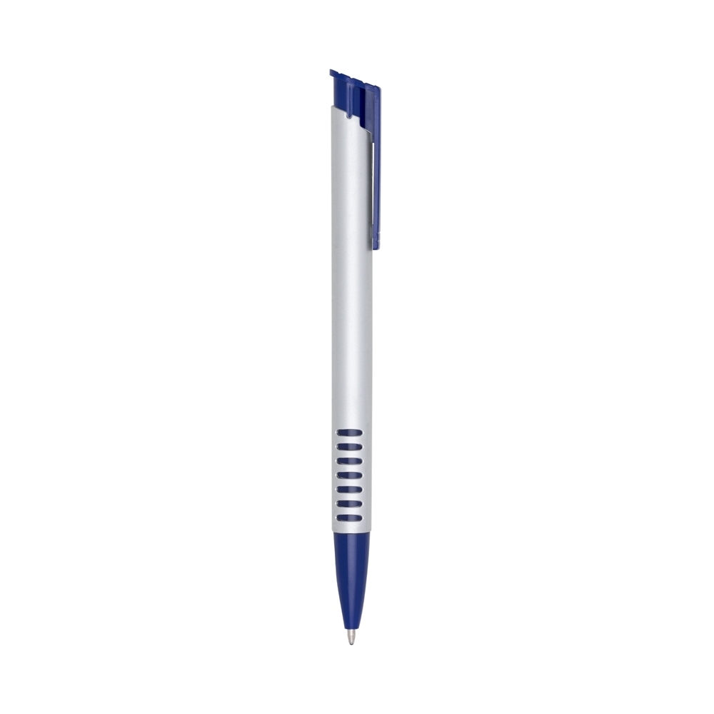 Pacote com 50 peças da caneta plástica com carga esferográfica azul e acionamento por clique.