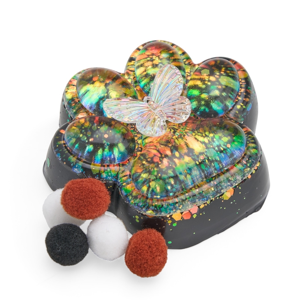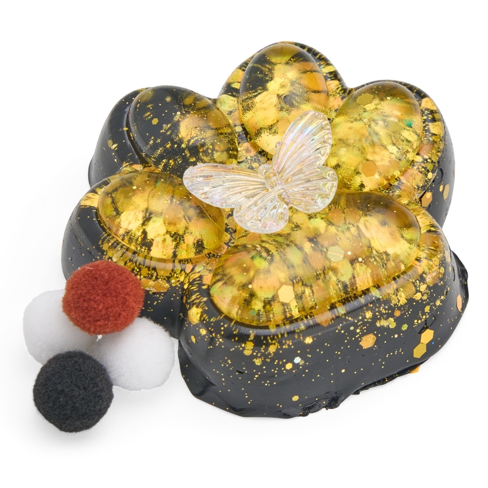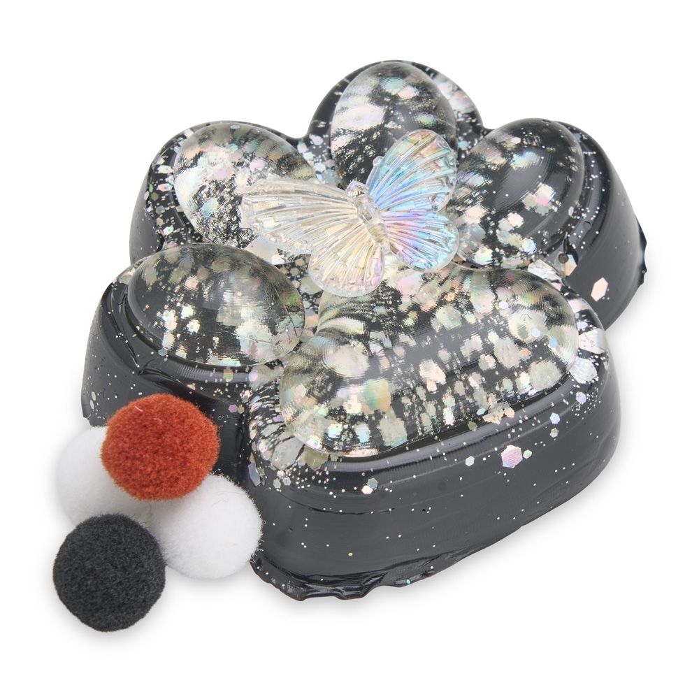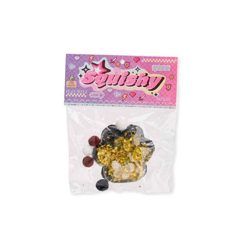 Brinquedo apertável antiestresse em formato de pata estilizada, produzido em borracha termoplástica lisa e macia. Adere facilmente a superfícies planas e acompanha bolinhas de pelúcia para decoração.