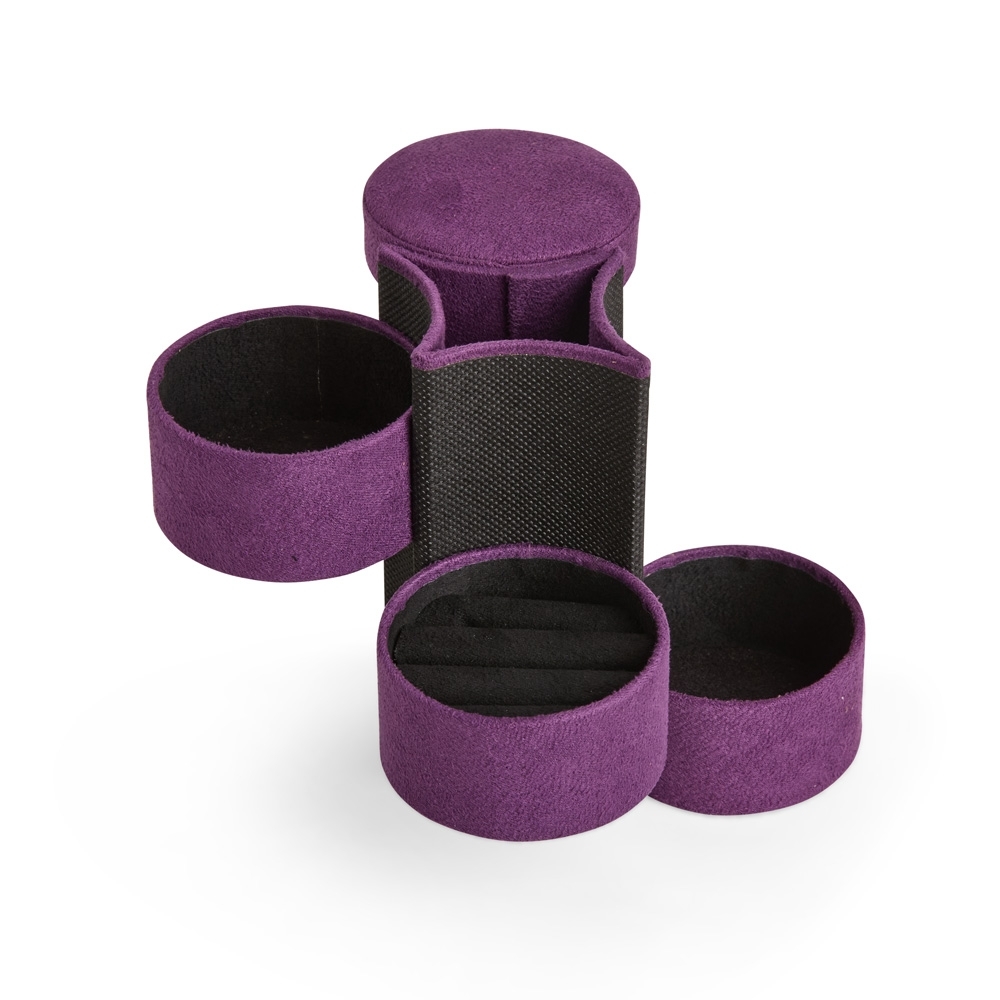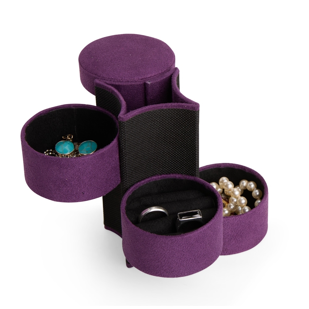 Porta-joias com revestimento externo aveludado em formato cilíndrico e botão metálico de fechamento. Apresenta três compartimentos internos, incluindo um com almofadas para anéis e brincos.