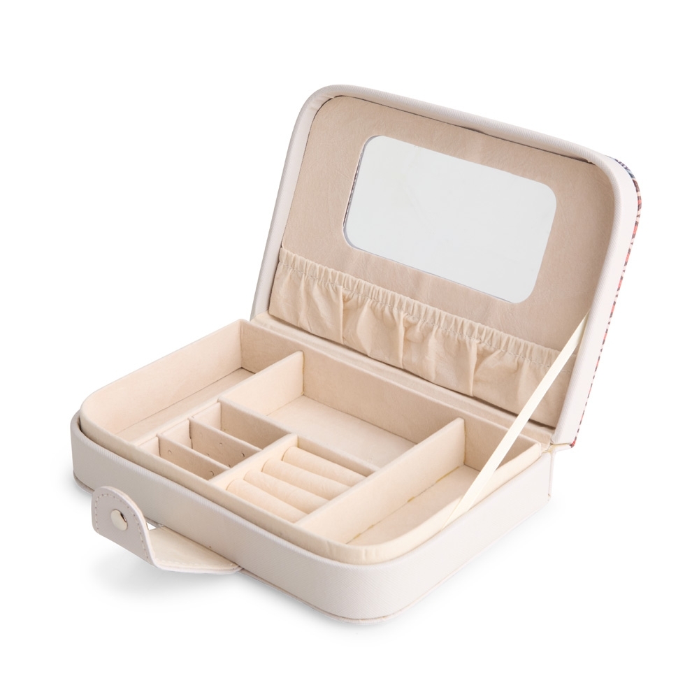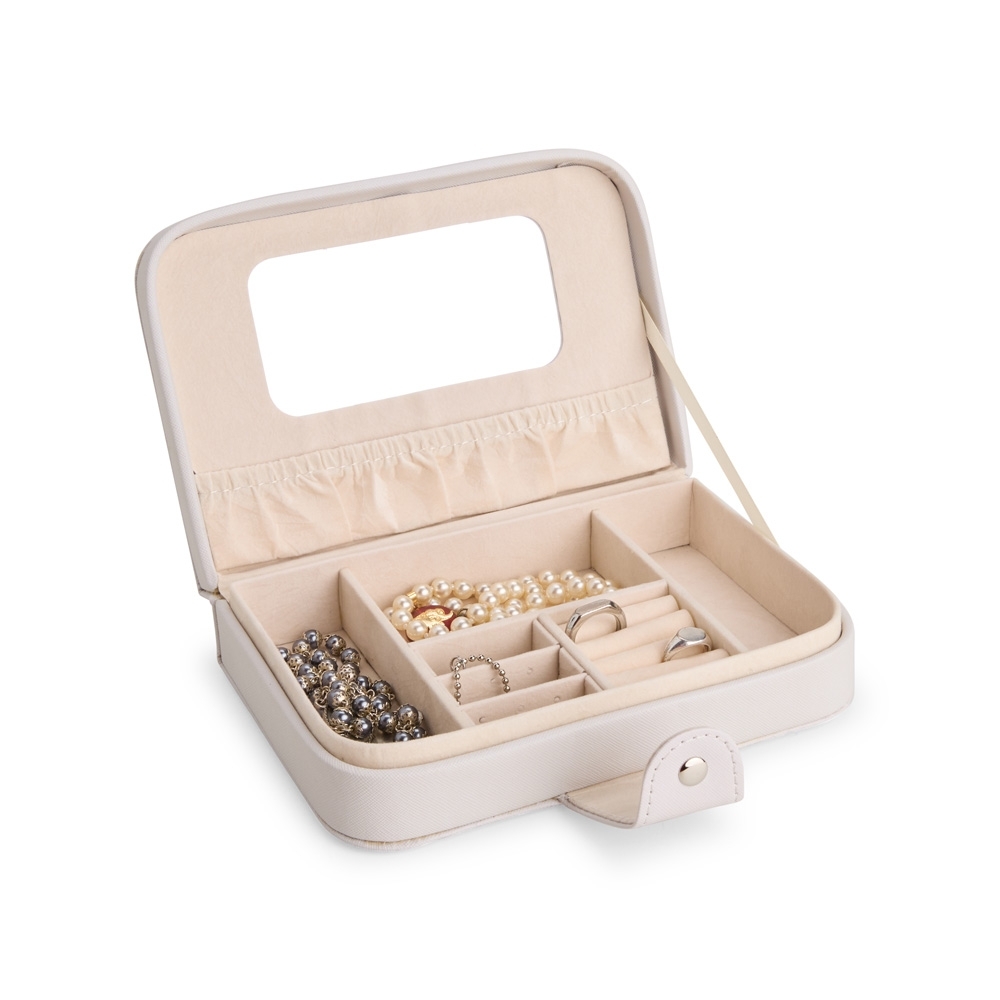 Porta-joias em tecido sintético com revestimento interno em veludo e fechamento por botão. Possui espelho e bolso com elástico no interior da tampa, além de divisórias em tamanhos diferentes, incluindo uma com almofadas para guardar anéis e brincos.