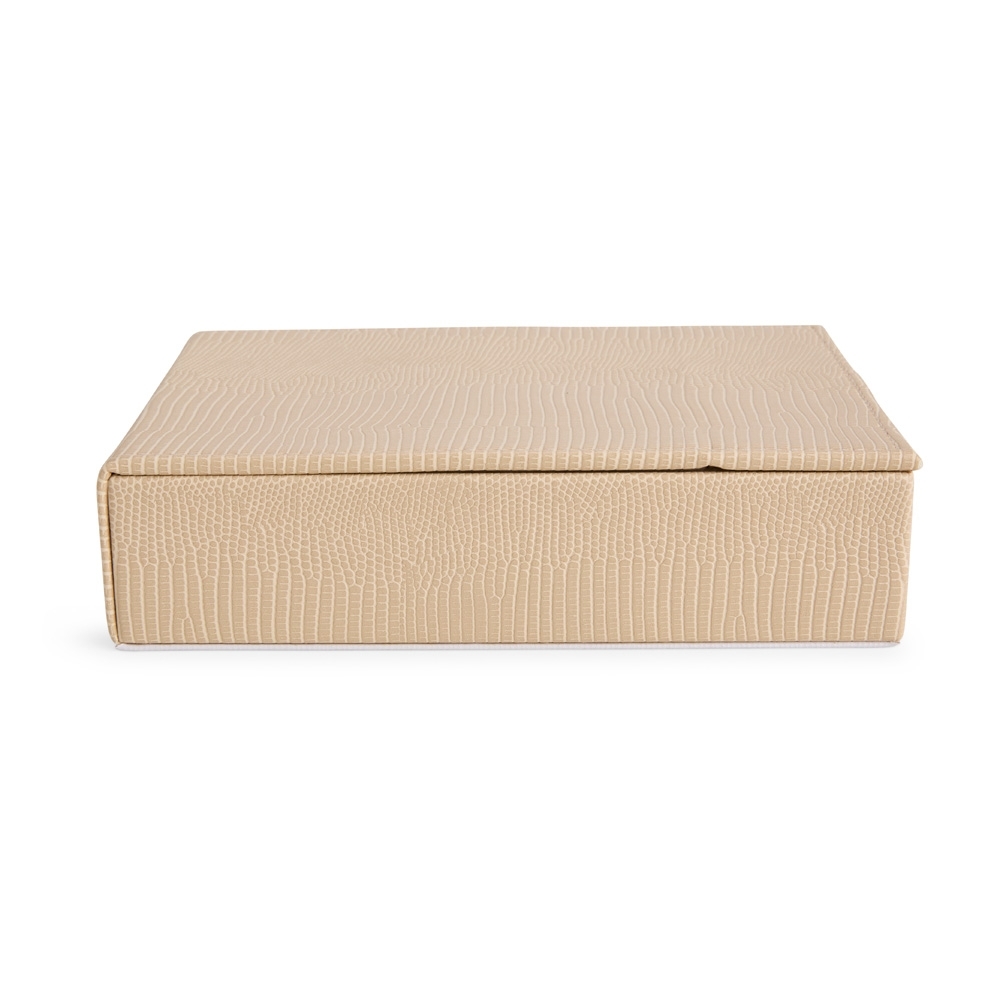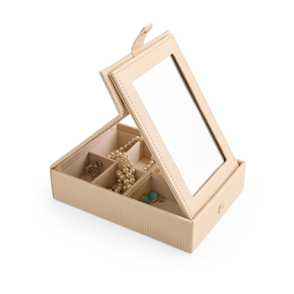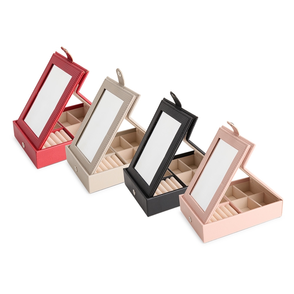 Porta-joias em couro sintético texturizado com fechamento por botão magnético. Possui um espelho retangular fixo à uma aba na tampa articulada do estojo, oferecendo opções de ajuste de inclinação. Dispõe também de revestimento interno aveludado e seis divisórias em tamanhos variados, sendo um deles com almofadas para anéis e brincos.