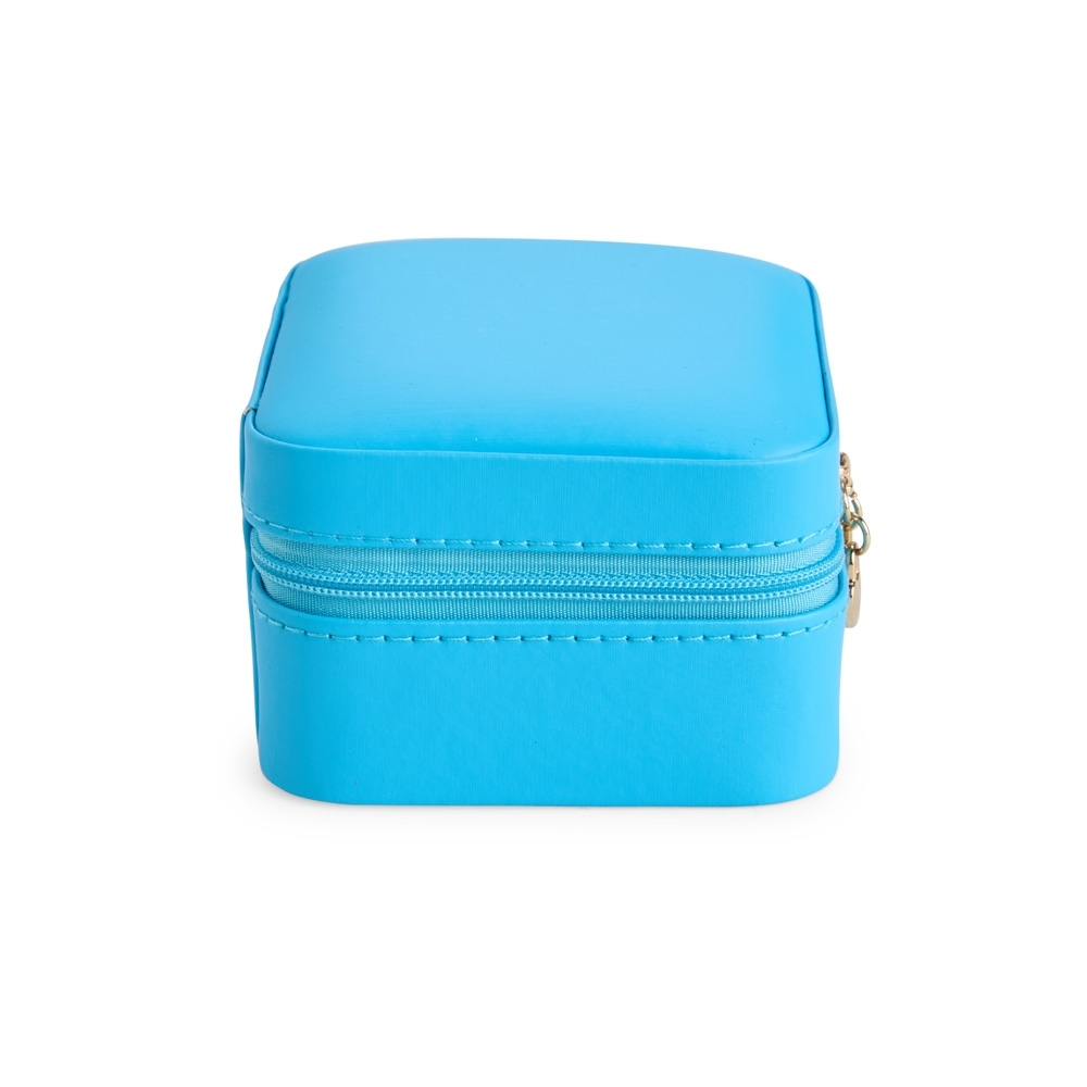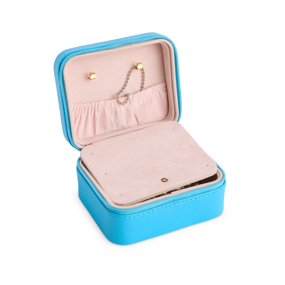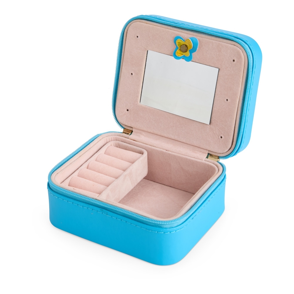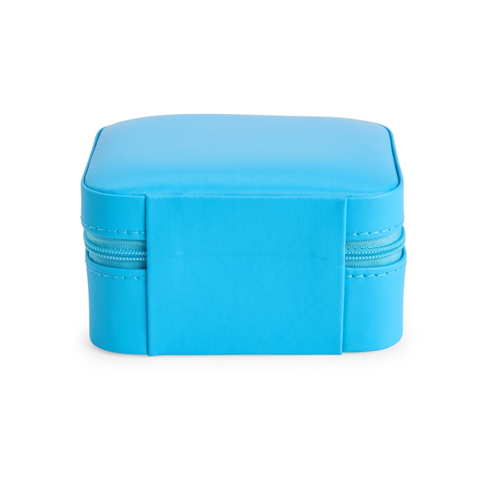 Porta-joias em couro sintético de textura lisa com revestimento interno aveludado e fechamento em zíper com puxadores no formado de coração. Possui compartimento principal com divisória almofadada para anéis e brincos, além de dois ganchos e um bolso com elástico no interior da tampa, além de um espelho retangular na parte central do estojo.