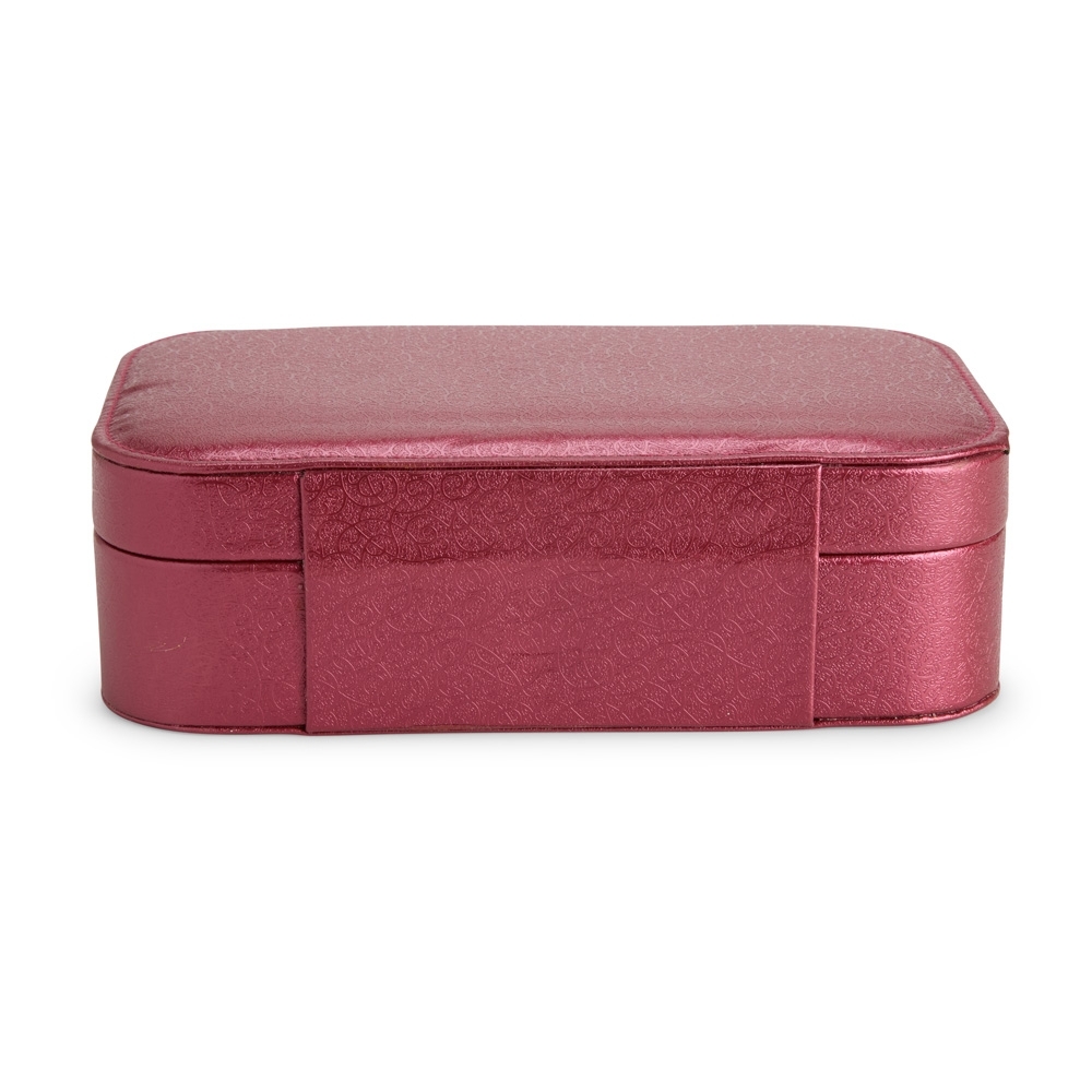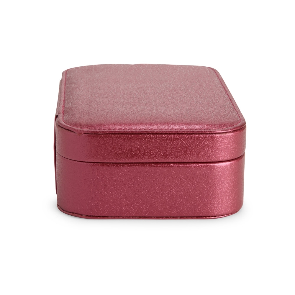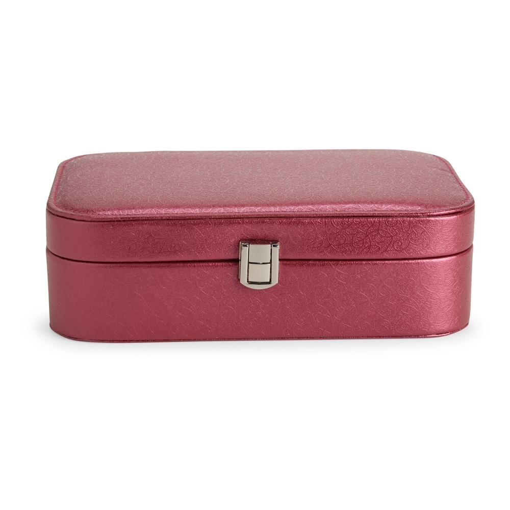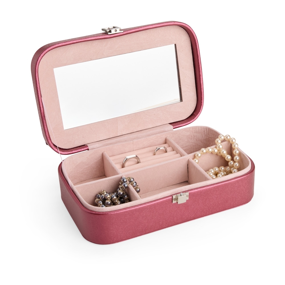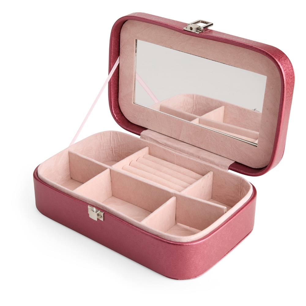 Porta-joias em couro sintético com detalhes texturizados e trava de segurança para fechamento. Possui revestimento interno aveludado, um espelho retangular fixo e seis compartimentos em tamanhos diferentes, incluindo divisória com almofadas para guardar anéis.