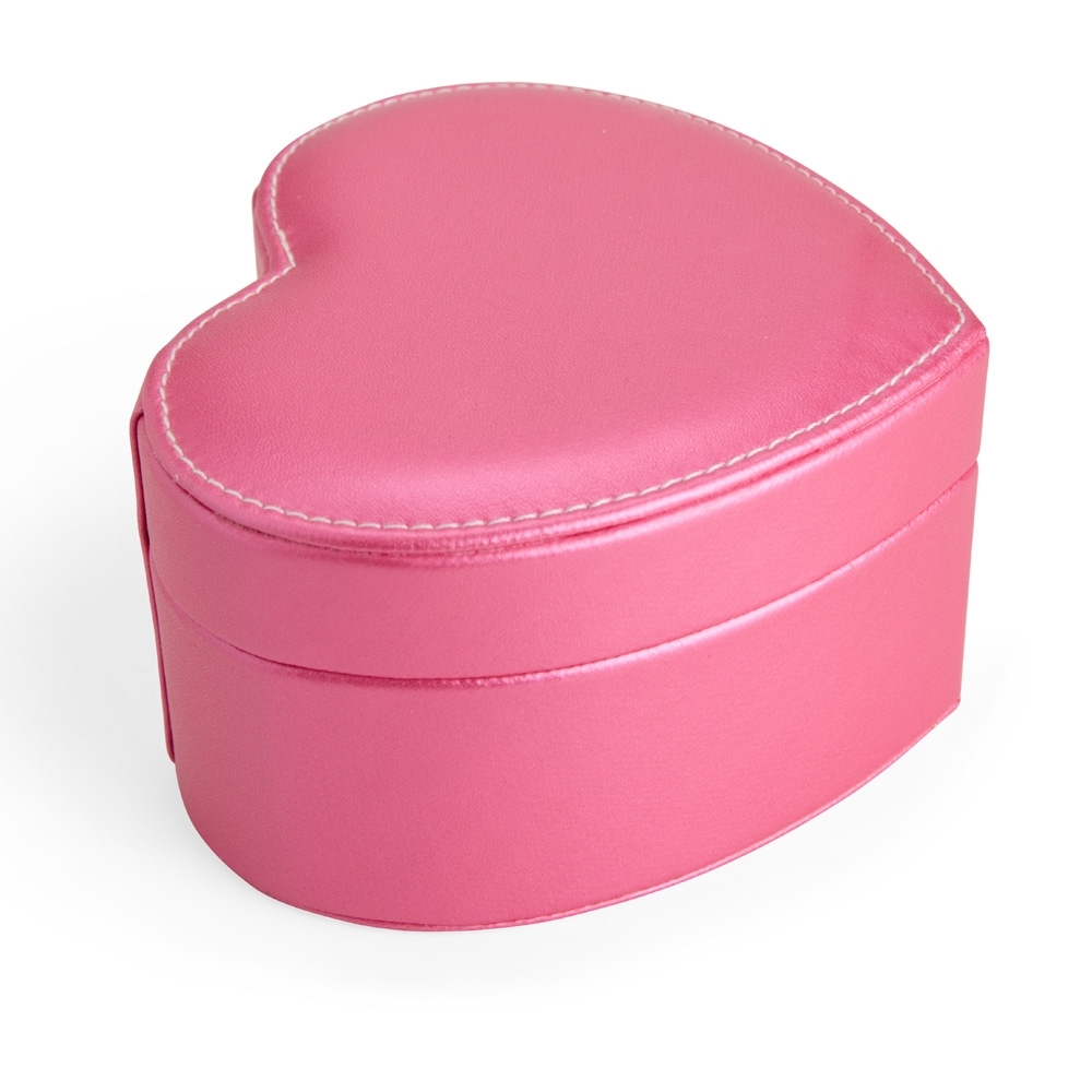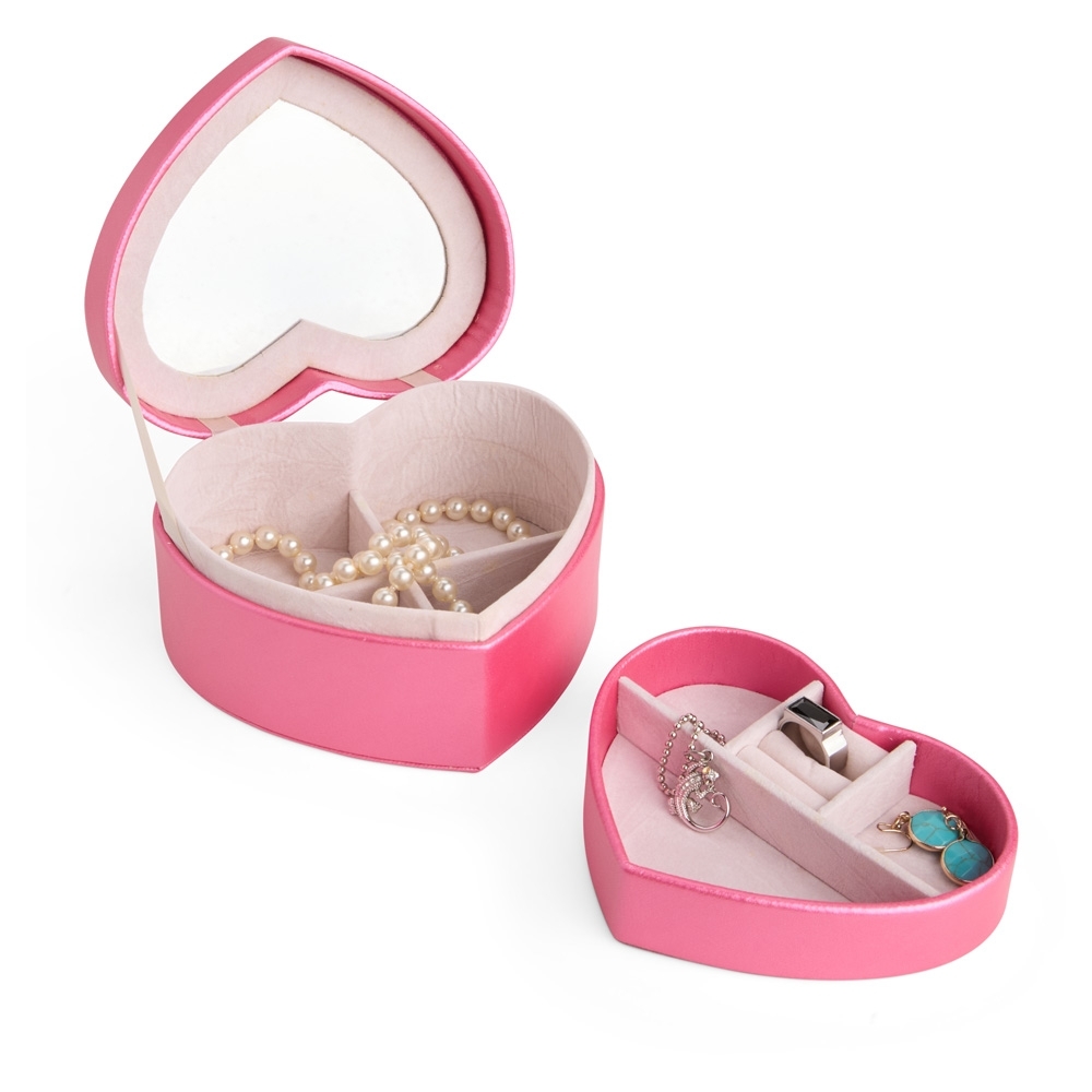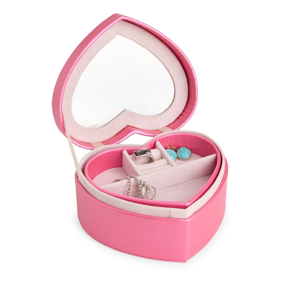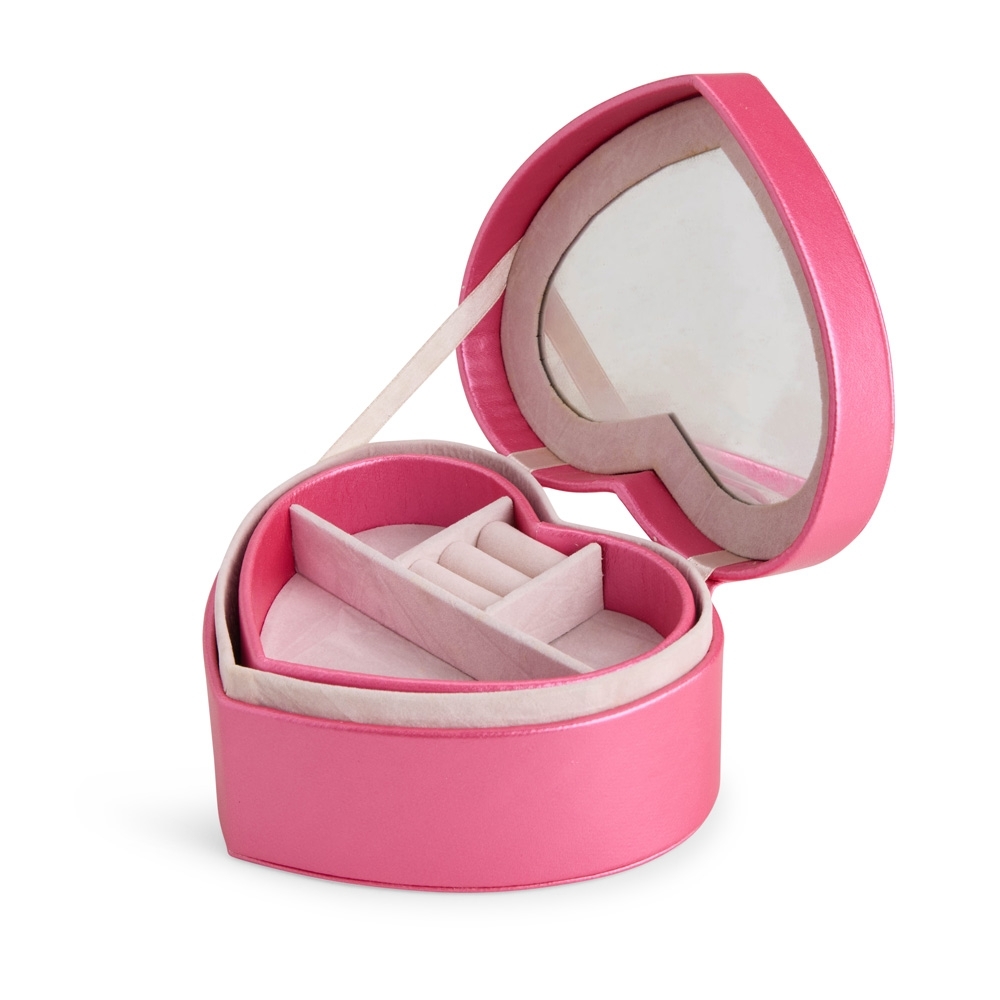 Porta-joias em couro sintético com formato de coração e revestimento interno aveludado. Conta com espelho interno e dois compartimentos principais: o superior, removível, com quatro divisórias em diferentes tamanhos, uma delas com almofadas para abrigar anéis e brincos; e o inferior, com mais quatro divisórias.