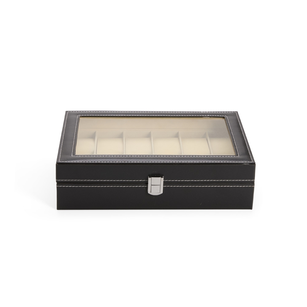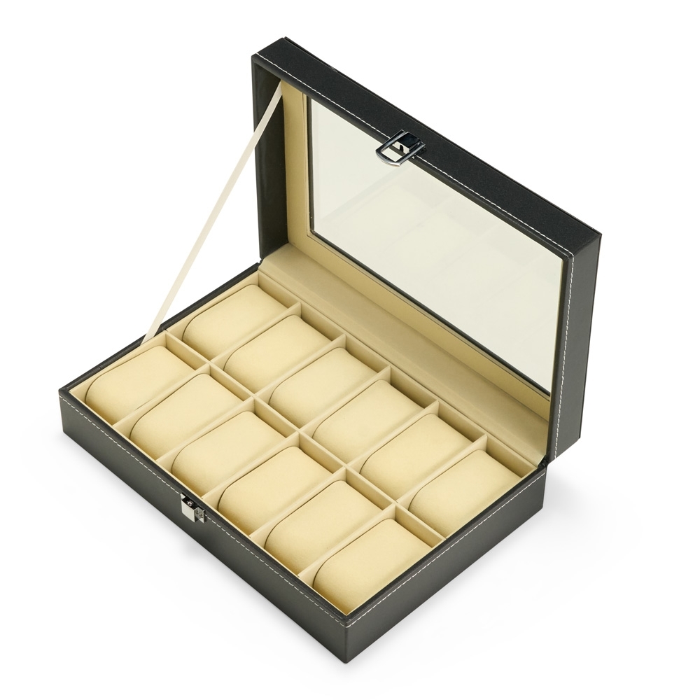 Porta-relógios com acabamento em couro sintético à base de PVC e revestimento interno em veludo. Conta com 12 compartimentos fixos com almofadas removíveis em espuma, além de visor feito em vidro e trava de segurança para fechamento do estojo.