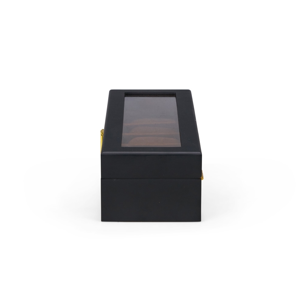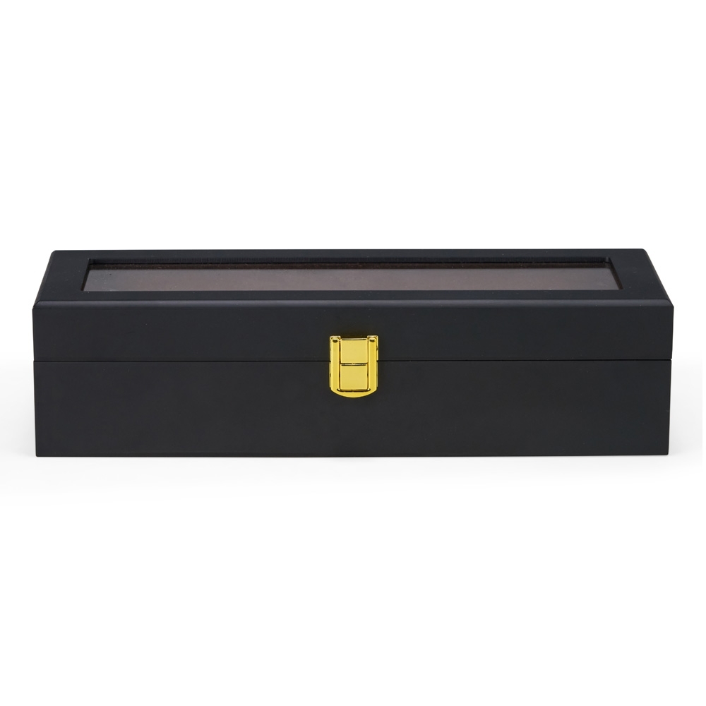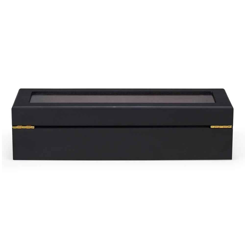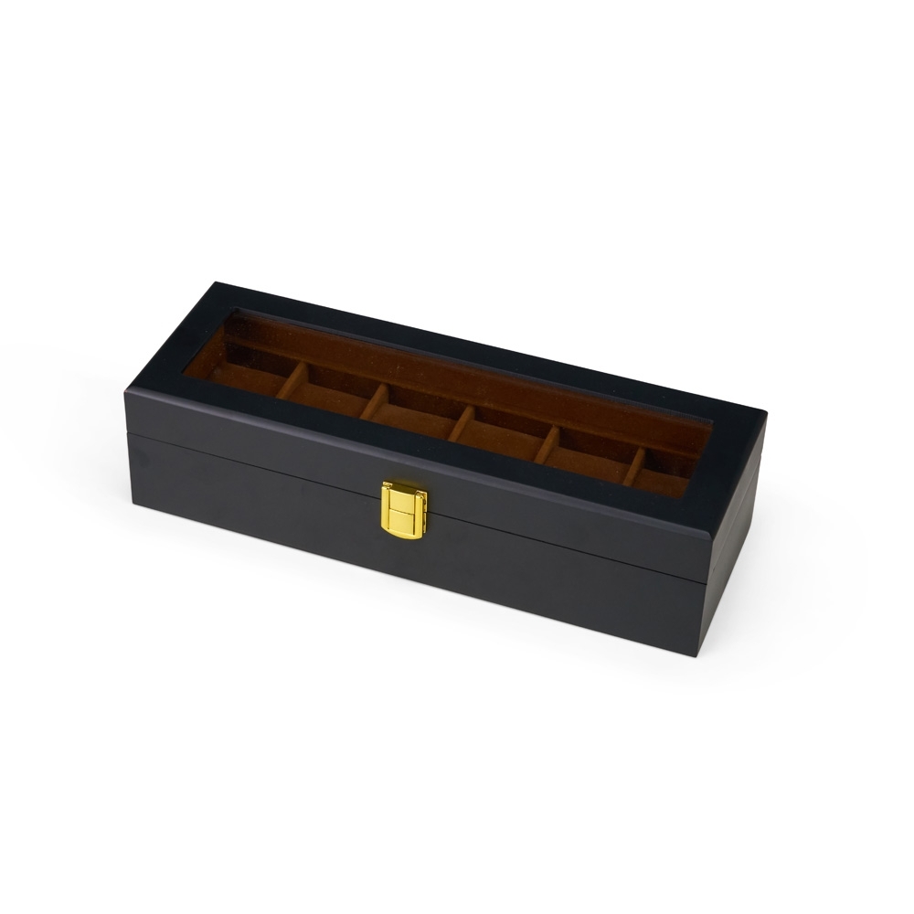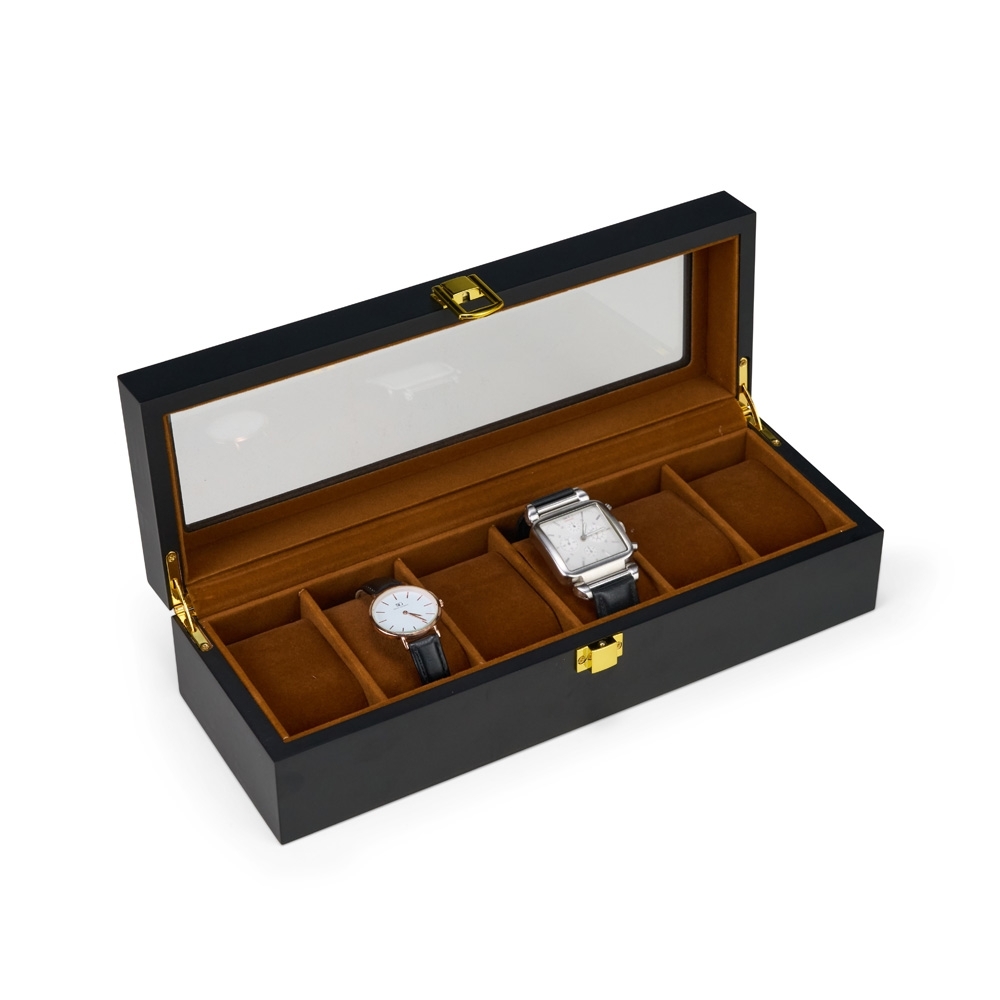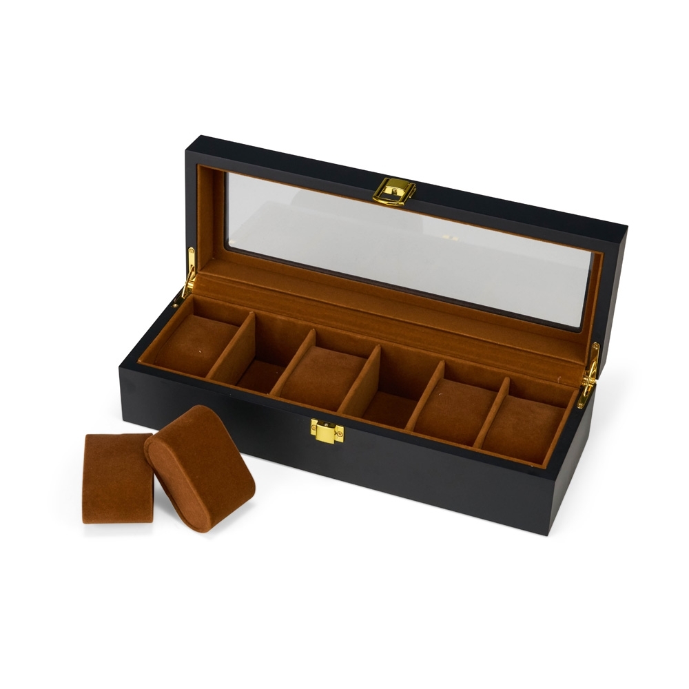 Porta-relógios feito em MDF de acabamento laqueado e revestimento interno em tecido peluciado. Possui seis divisórias com almofadas removíveis, visor em vidro e trava de segurança para fechamento da tampa.