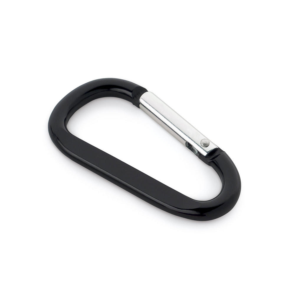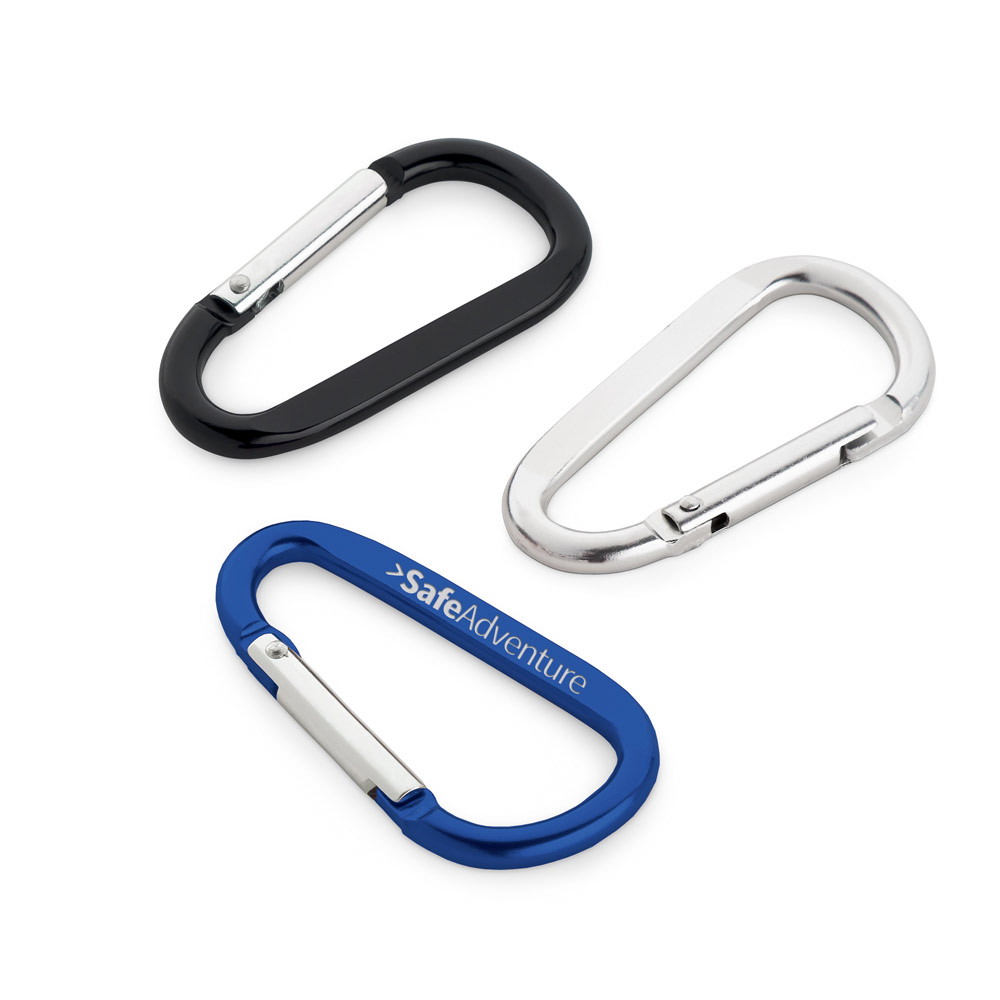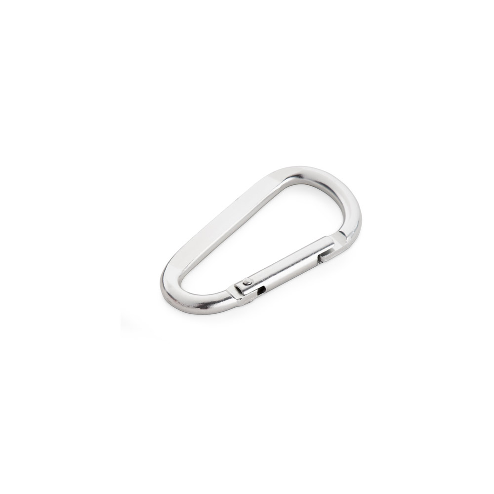 Mosquetão em alumínio com área plana para gravação. 32 x 57 x 5 mm