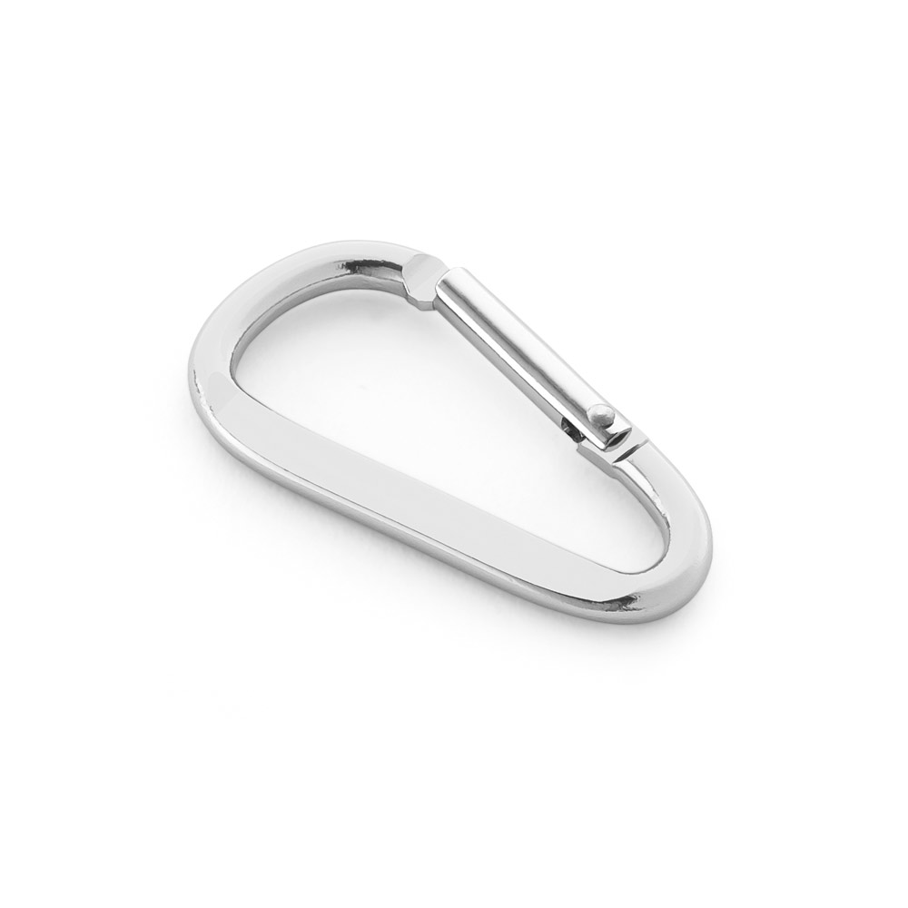 Mosquetão em alumínio com área plana para gravação. 24 x 48 x 4 mm
