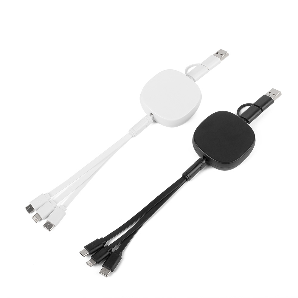 Cabo USB retrátil com acabamento em Bambu. Contém entradas Lightning/iPhone, V8/Android e Tipo-C/Android, USB e USBC. Suporte com rolamento e trava automática. Suporte com frente lisa e parte traseira com área para aplicação de adesivo ou etiqueta resinada.