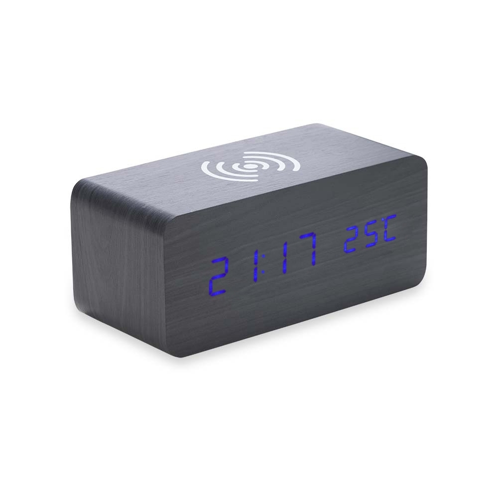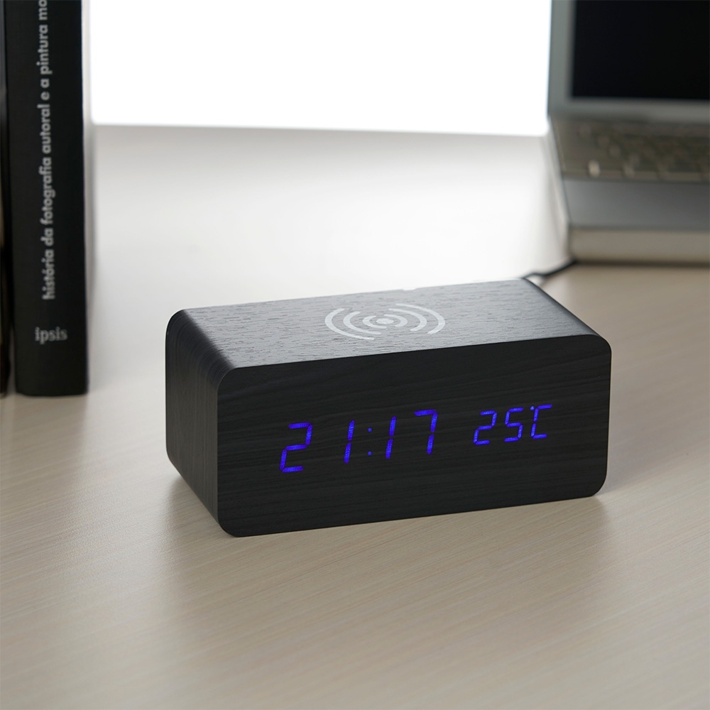 Estilo e praticidade na hora certa! O nosso Relógio digital LED possui alarme, medidor de temperatura e carregamento por indução, carregando smartphones e outros dispositivos compatíveis de forma rápida e fácil, sem a necessidade de fios. Totalmente produzido em MDF, com um display em LED, parte traseira com mecanismo para ajustes, entrada DC 5V e compartimento de pilhas. Podendo ser utilizado através da fonte USB (acompanha) ou 3 pilhas AAA (não acompanha).