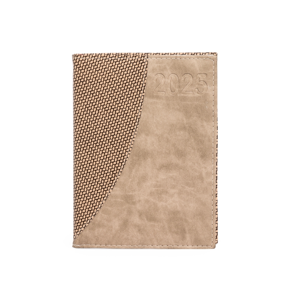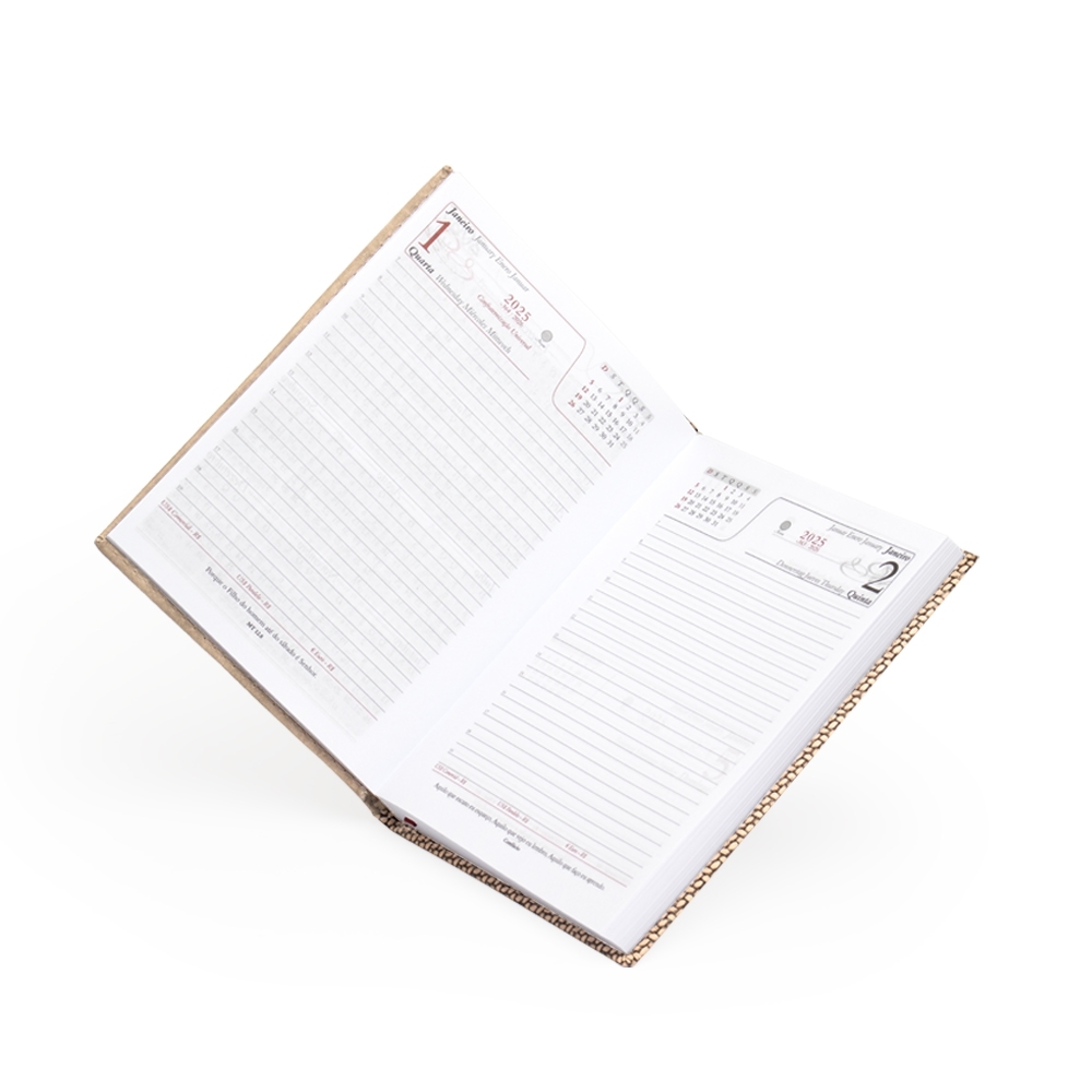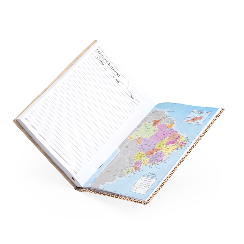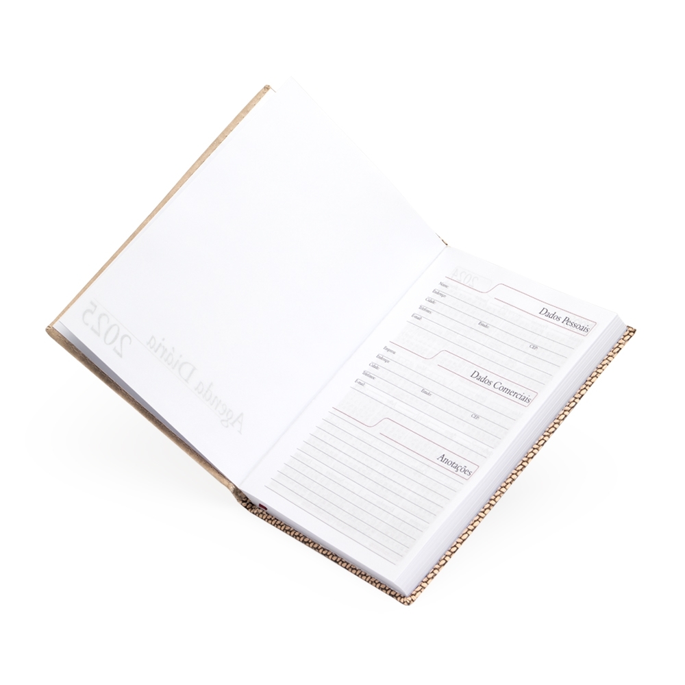 Agenda diária 2025 de couro sintético. Contém fita de cetim marca página, dados pessoais, calendário de 2024, 2025 à 2026, mapa do Brasil, mapa-múndi, índice telefônico e planejamento.