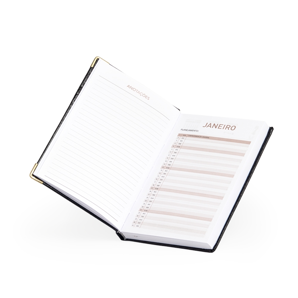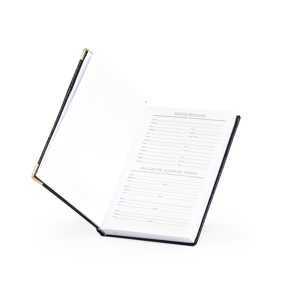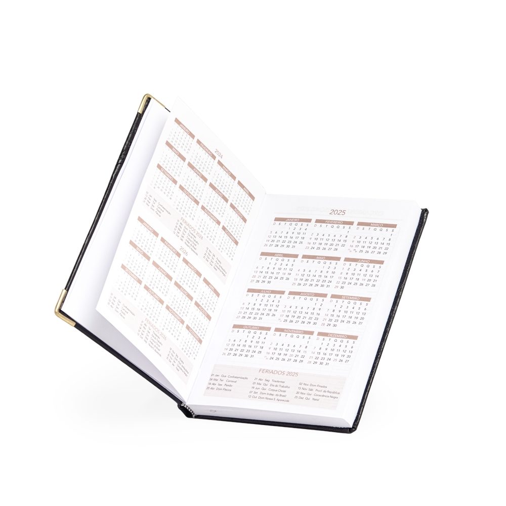 Agenda diária 2025 de couro sintético. Contém fita de cetim marca página, dados pessoais, calendário de 2024 à 2026, mapa do Brasil, mapas, índice telefônico e planejamento. Altura :  20,4 cm Largura :  14,1 cm Espessura :  2,1 cm Medidas aproximadas para gravação (CxL):  3 cm x 5 cm Peso aproximado (g):  418