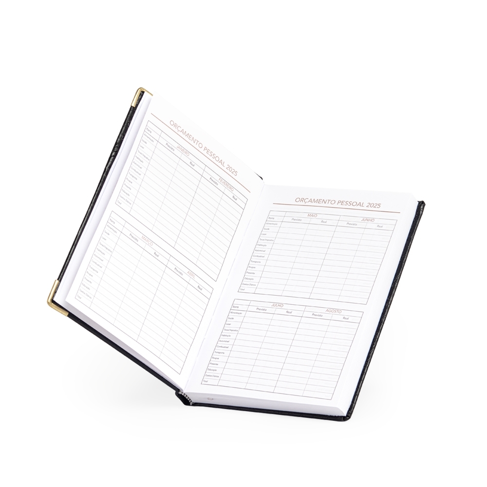 Agenda diária 2025 de couro sintético. Contém fita de cetim marca página, dados pessoais, calendário de 2024 à 2026, mapa do Brasil, mapas, índice telefônico e planejamento.