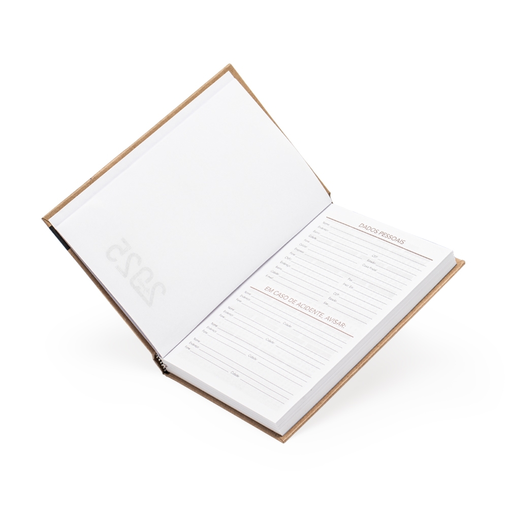 Comece o ano de forma ordenada e planejada com nossa Agenda Diária 2025. Feita em kraft, ela combina simplicidade com um toque de elegância natural. Possui espaço para dados pessoais, calendário de 2024 a 2026, planejamento mensal e espaço dedicado aos aniversariantes importantes.