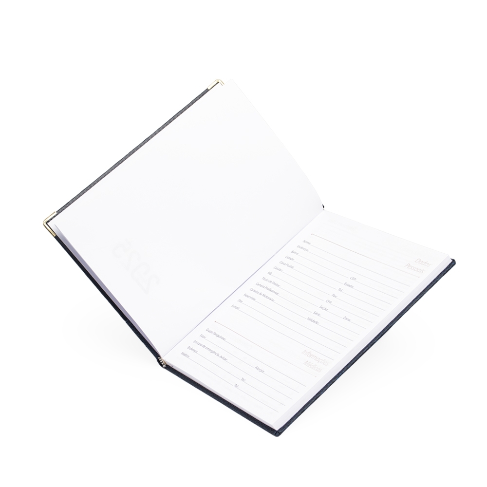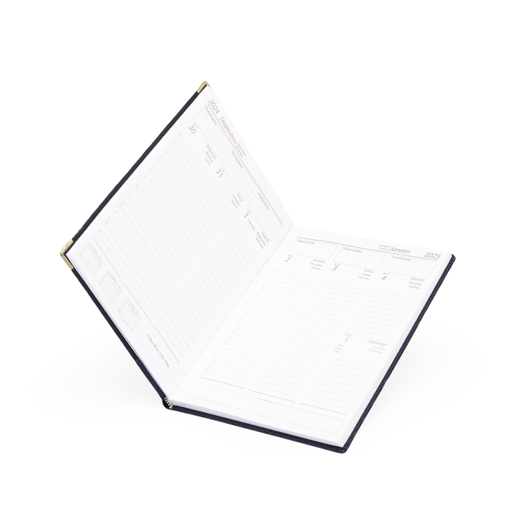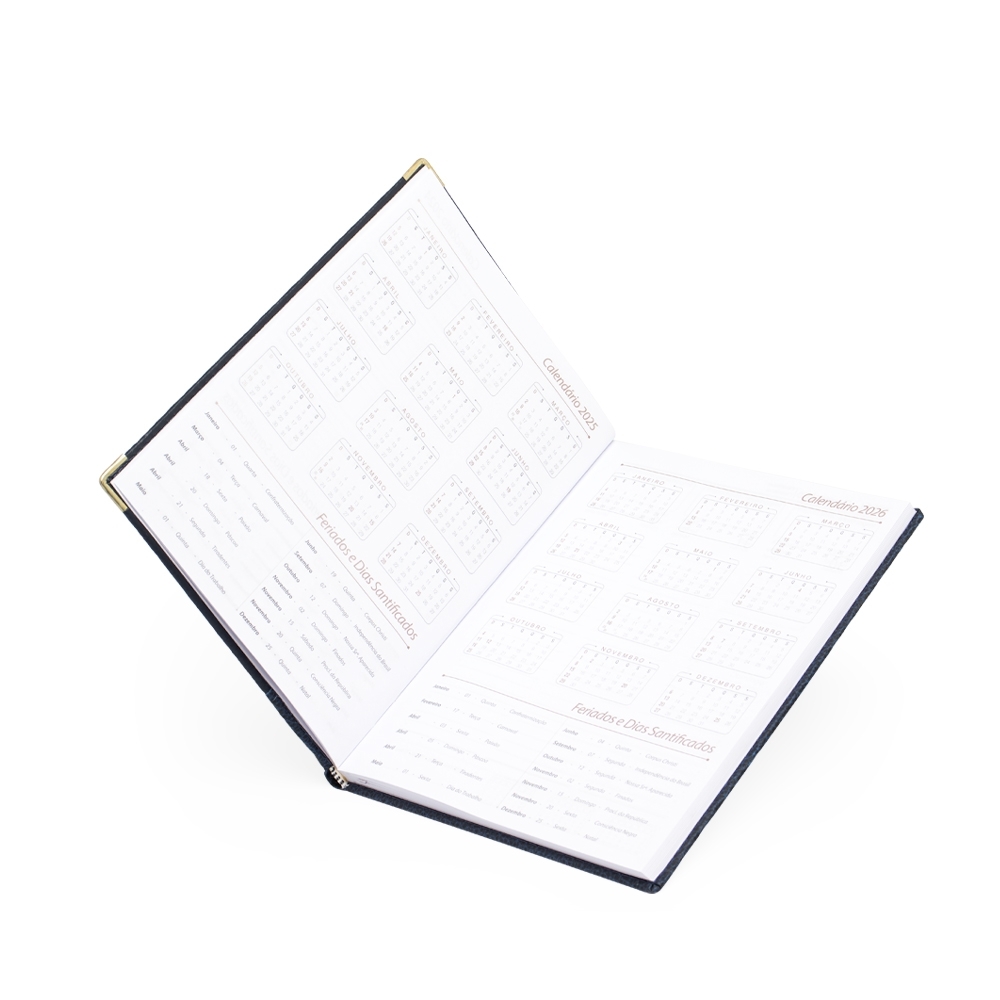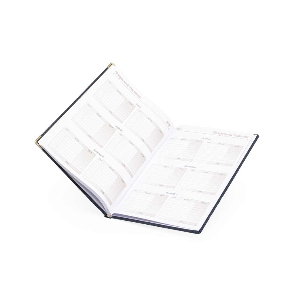 Agenda diária 2025 de couro sintético. Contém fita de cetim marca página, dados pessoais, calendário de 2024 à 2026, mapas, telefone Úteis, planejamentos, códigos do serviço DDI e DDD. Altura :  20,7 cm Largura :  14,1 cm Espessura :  2,5 cm Medidas aproximadas para gravação (CxL):  17 cm x 8 cm Peso aproximado (g):  419
