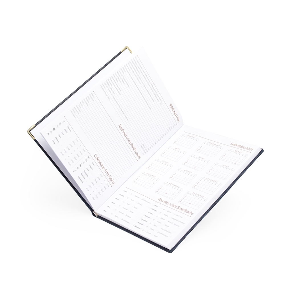 Agenda diária 2025 de couro sintético. Contém fita de cetim marca página, dados pessoais, calendário de 2024 à 2026, mapas, telefone Úteis, planejamentos, códigos do serviço DDI e DDD.