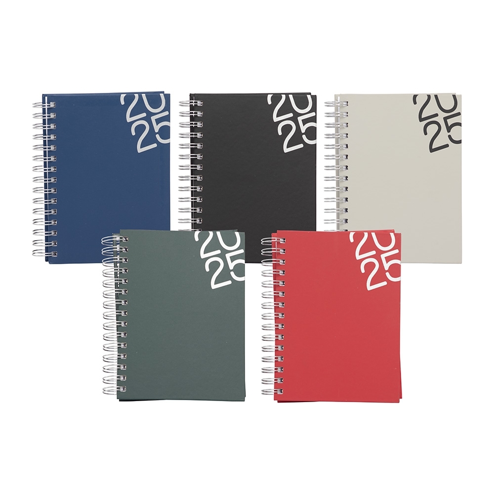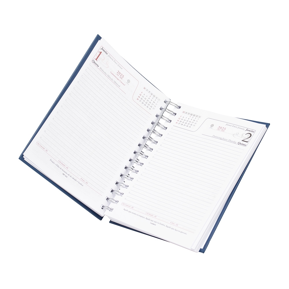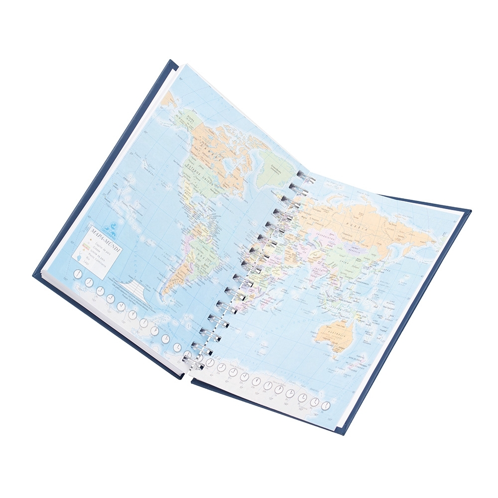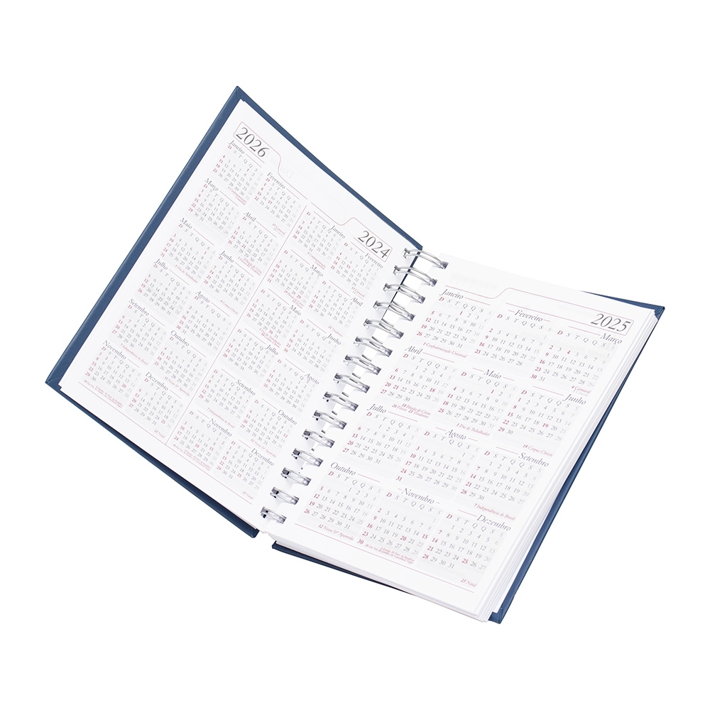 Agenda Wire-o produzida em material sintético, contém “bolso” plástico atrás da capa, dados pessoais, calendário de 2024 à 2026, mapa do Brasil, mapa-múndi, índice telefônico e planejamento.