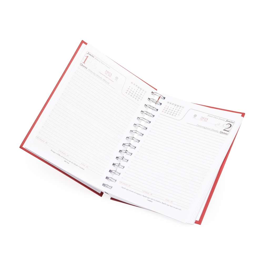 Agenda diária wire-o com capa produzida em prime, contém bolso plástico atrás da capa, dados pessoais, calendário de 2024 à 2026, mapa do Brasil, mapa-múndi, índice telefônico e planejamento. Altura :  20 cm Largura :  16 cm Espessura :  2,5 cm Medidas aproximadas para gravação (CxL):  19,7 cm x 13,2 cm Peso aproximado (g):  384
