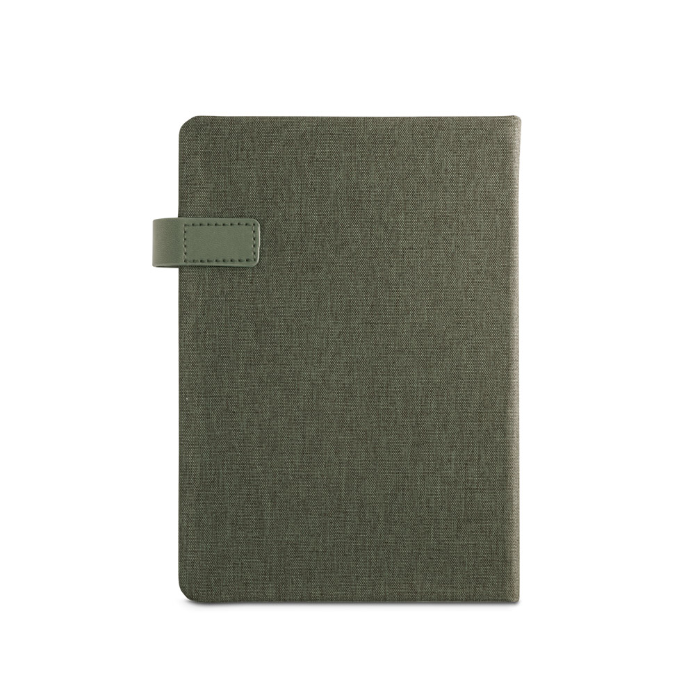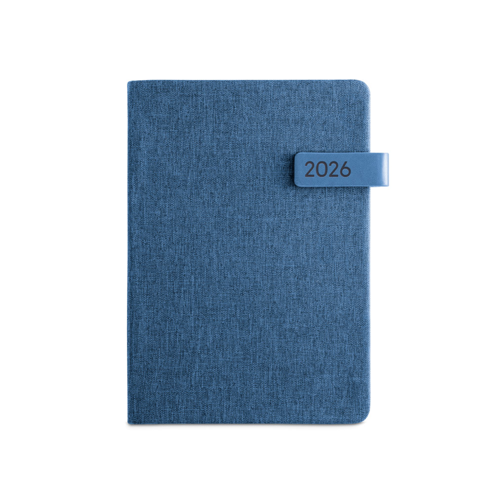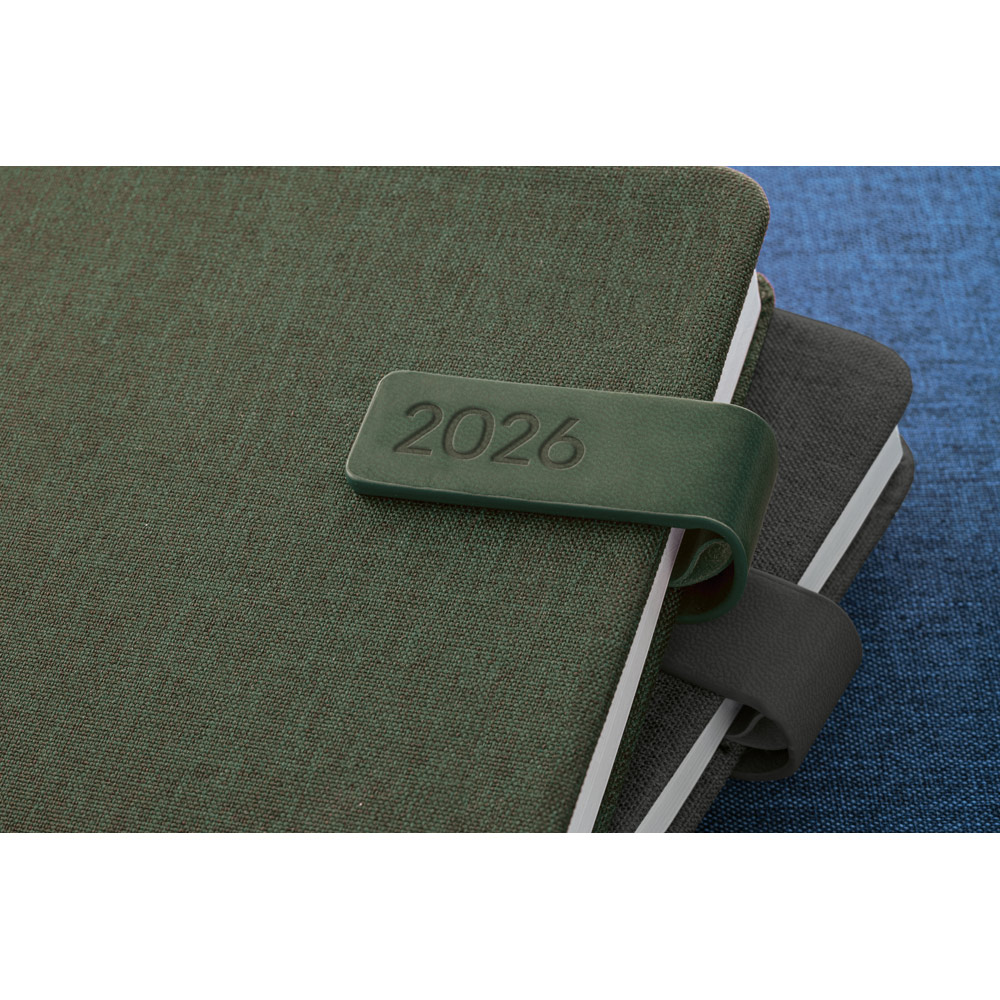 Agenda A5 em PET reciclado (100% rPET), com fecho magné,tico em PU. Possui um marcador em fita e suporte para esferográfica (não inclusa). Está organizada num plano diário. Fornecida com bolsa de TNT. 148 x 210 mm | Bolsa: 205 x 250 mm