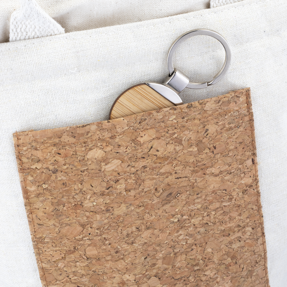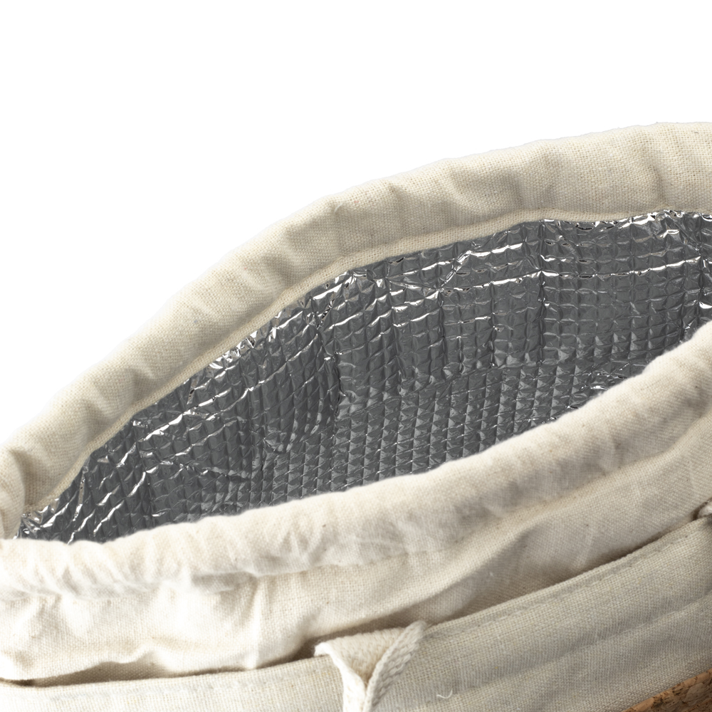 Bolsa térmica em algodão e interior costurado revestido em alumínio, bolso frontal em cortiça, alça de mão e capacidade de até 4,8L. Sistema de fechamento por meio de cordão.