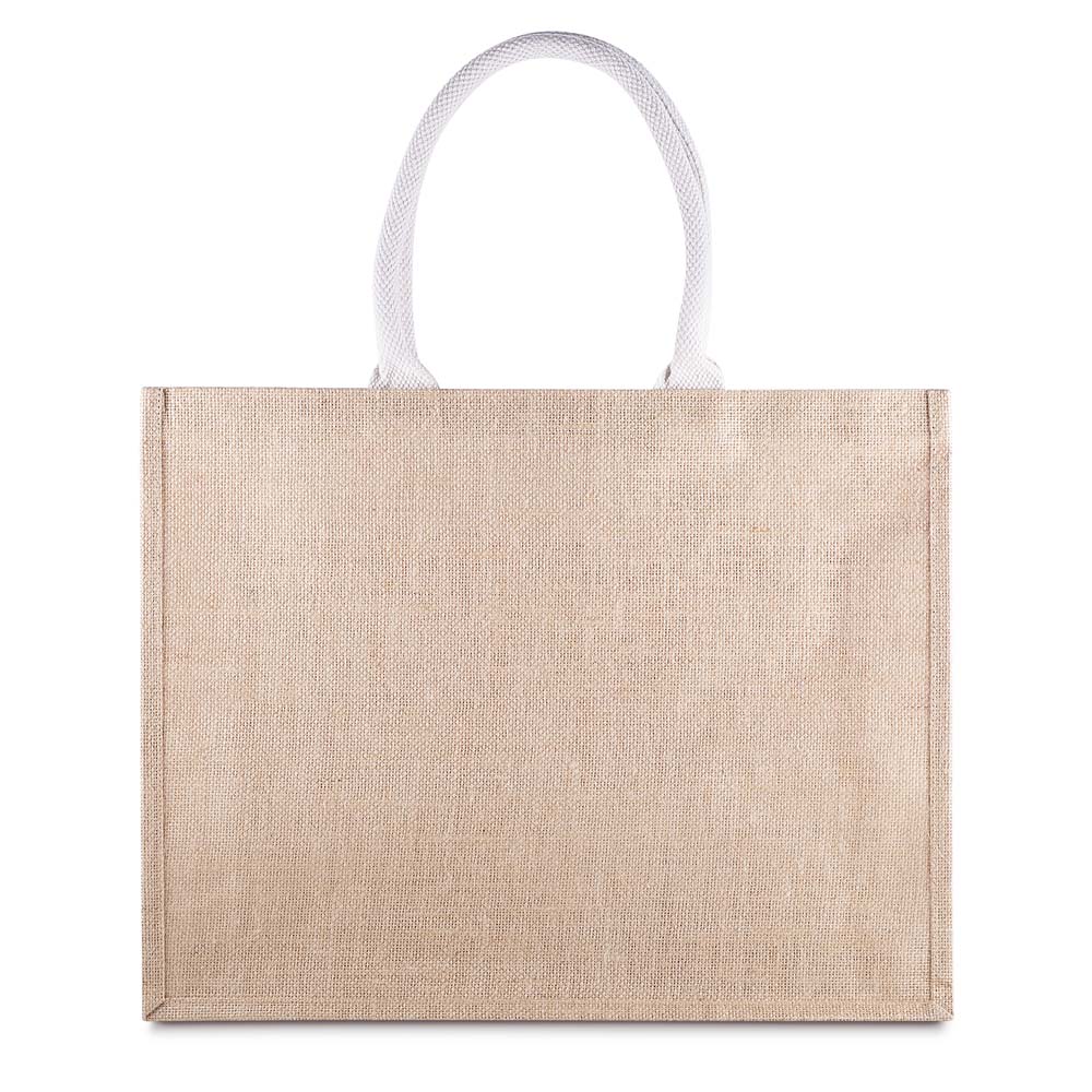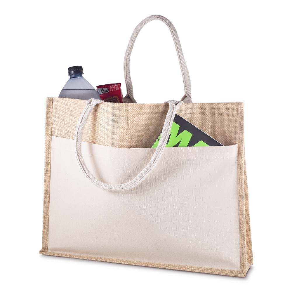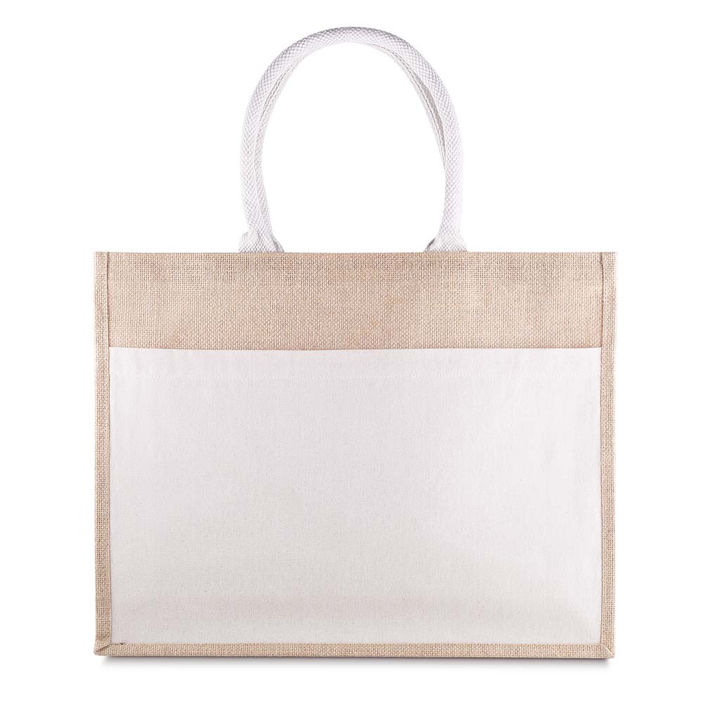 Sacola em Juta com bolso frotal em Algodão Cru 220g/m². Alças resistentes de Algodão Cru,interior revestido em plástico PP. Base plana para maior estabilidade. Alça com altura de 20 cm, ideal para transporte.