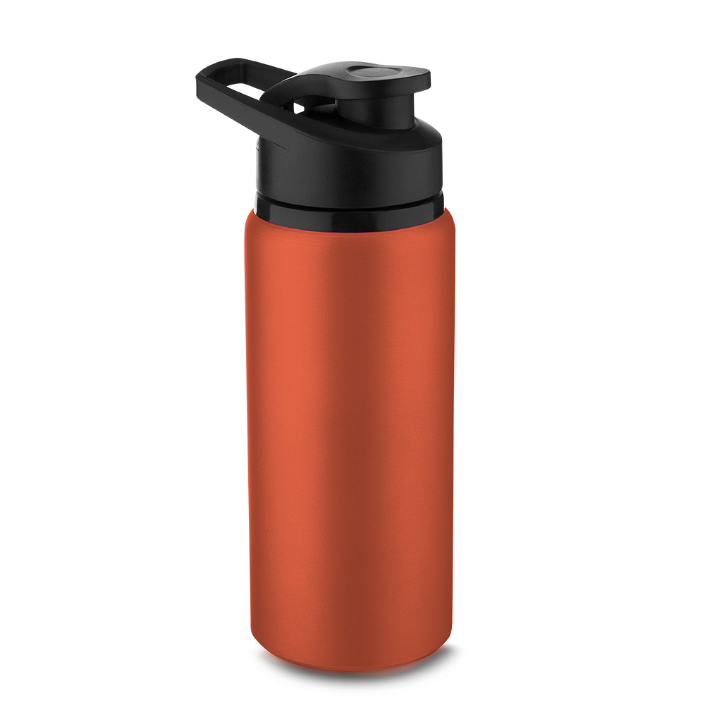 Garrafa de alumínio com capacidade de até 650ml em cores. Tampa rosqueável, bico com tampa vedada de acesso rápido, e alça para transporte.